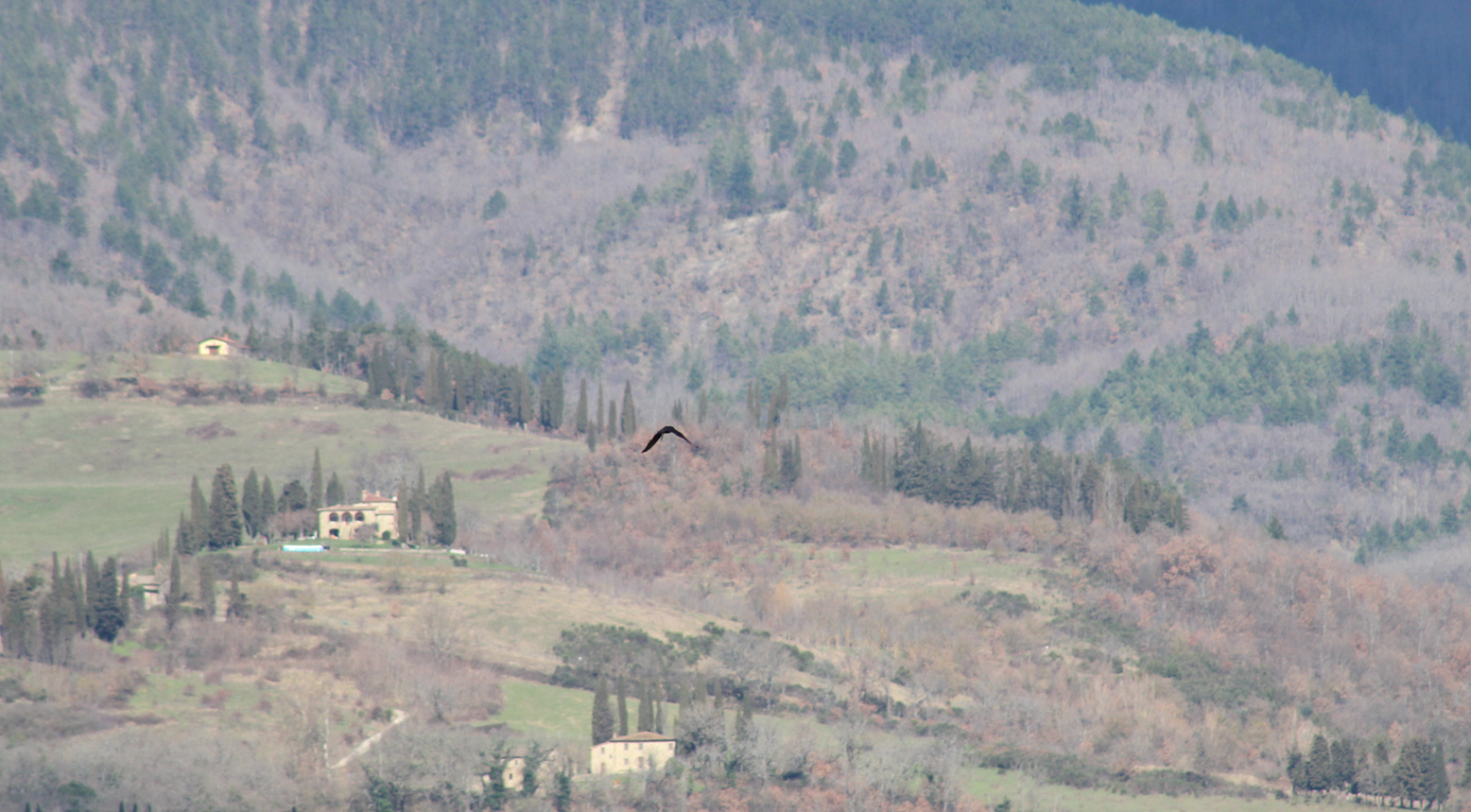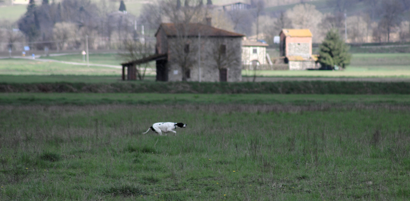 del falconiere s’alza in volo un maschio di pellegrino che guadagna immediatamente la quota più elevata e prende a roteare sull’arena erbosa, incassata in una valle fra le austere colline di questa prima porzione di Casentino. Noi non possiamo vedere i suoi occhi, ma lui può vedere i nostri, e può leggere ogni movimento che il cane, un bel breton bianco e marrone, compie intessendo sulla tela verde del campo dei lunghi, invisibili ricami. Domina l’aria, il falco. Ne gestisce ogni più piccola corrente, ne saggia la temperatura veleggiando senza sforzo apparente, ne intuisce le depressioni e si sposta come un’ombra da una parte all’altra della vasta campitura, sfiorando le cime dei grandi alberi. Il breton sbanda. Con un colpo di naso aggancia un effluvio che solo lui poteva sentire e poi lo risale repentino fino a fermarsi estatico verso un punto indefinibile del prato.