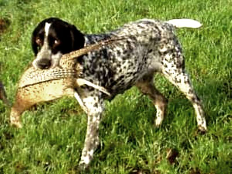 specie di filata fatta di fermate, accertamenti con il naso in alto per cogliere un indizio, trotterelli di poche battute, ancora arresti e poi alcuni passi fino alla ferma definitiva. “Faisan…” sibilò Antoine, e strinse il fucile avvicinandosi alla sua bracca blu, seguito da me con gli occhi fissi sulla cagna. Valine iniziò a rompere la ferma, fece ancora due passi e un istante dopo, dieci metri più avanti si alzò un maschio di fagiano gridando come un diavolo. Il bel tiro e la spettacolare caduta del fagiano provocarono l’immediato accorrimento della bracca che lo afferrò a piena bocca e, accompagnata dal perentorio quanto inutile comando del padrone, lo riportò scodinzolando freneticamente. La cagna fu perfetta, anche e soprattutto nell’intuire prontamente, con una prova d’olfatto magistrale, la mossa del fagiano di iniziare la pedinata. Se non si fosse mossa, rimanendo ancorata ad una traccia olfattiva non più direttamente connessa all’animale, in un bosco di quel genere l’avremmo sicuramente perduto.