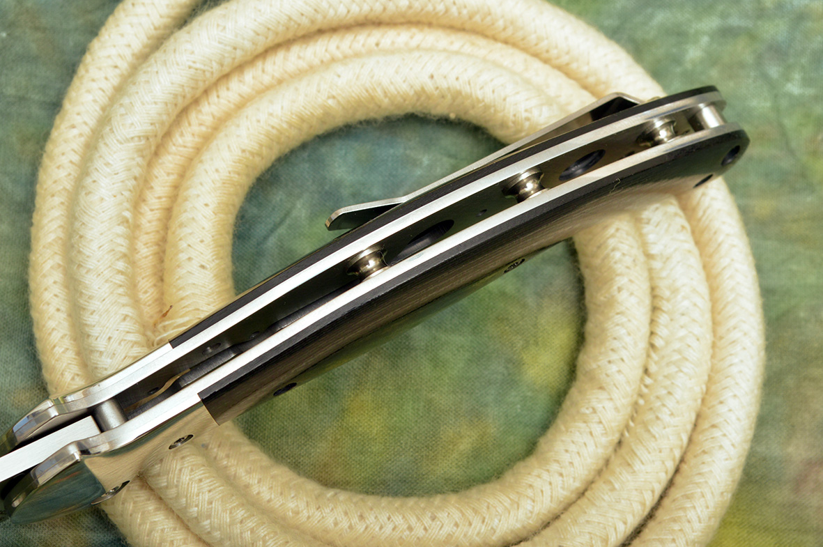 Il dorso della lama è rettilineo mentre il tagliente assume la curva che solitamente caratterizza le lame drop-point. Il manico è completamente aperto per facilitare la pulizia; uno dei distanziali è forato e un foro su ciascuna guancetta, in corrispondenza di quello del distanziale, consente l’aggancio di un correggiolo. Il manico, in G10, dà piena ragione a Gabor Szakonyi, il progettista. La forma delle testine evita che la mano possa scivolare in avanti nei rari lavori di punta e l’ergonomia è eccellente. Non si può descriverla perché bisogna davvero provarla; il coltello si trasforma in un naturale prolungamento della lama. Il prezzo è robusto, ma il coltello è davvero eccellente; se esiste un coltello tuttofare per affrontare le attività all’aperto, qui ci siamo.
