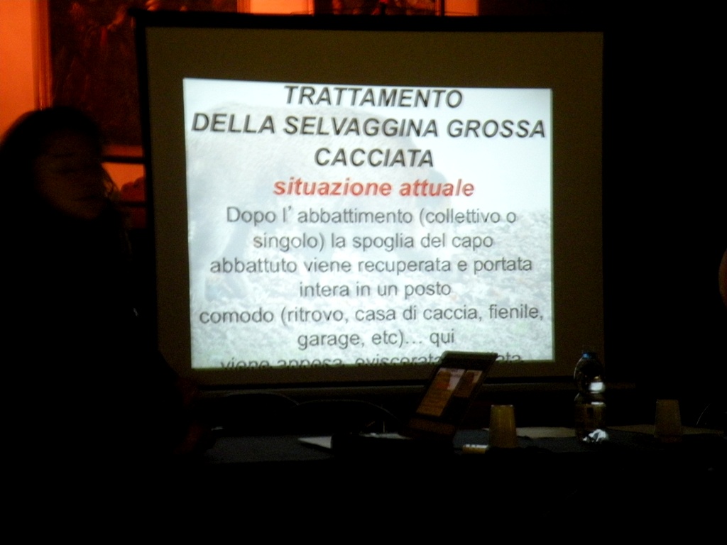 La dottoressa Daniela Giustini, Biologa e Tecnica Faunistica, ha affrontato la questione relativa alla qualità delle carni di selvaggina, che per giungere sulle nostre tavole, non solo gradevoli al palato ma soprattutto sicure per l’alimentazione del nostro organismo, devono seguire un preciso iter che parte fin da momento dell’abbattimento del’animale a cui appartenevano. “Spesso si pensa che su questo argomento si sia detto tutto che le tradizioni tramandate di generazione in generazione siano le sicure custodi di metodi sperimentati nei tempi. Non è così” ha esordito la dottoressa Giustini. “Considerando una giornata di caccia tipo non possiamo che constatare che, e non potrebbe essere altrimenti, il momento nel quale la carne del capo abbattuto arriva nel congelatore è dopo molte ore il suo abbattimento. Proprio per questo sono fondamentali alcuni passaggi che ci permettano di conservare la carne nel migliore dei modi proprio fino a quel momento”. “Cominciamo con il dire – ha proseguito la Giustini – che l’ideale, anche se chiaramente non è sempre possibile, sarebbe che l’abbattimento avvenisse nelle ore più fresche della mattinata ed evitando le ferite all’addome dell’animale in quanto portano alla contaminazione della carne. Una volta abbattuto il selvatico è fondamentale eviscerarne la carcassa il prima possibile, evitando di abbandonare le interiora nel bosco. Più ritardiamo questa fondamentale operazione più la carne alla fine risulterà dura e dal sapore forte. Non solo, una manipolazione sbagliata dopo l’abbattimento anch’essa porterà a qualità inferiore delle carni. E’ bene ricordare che il proiettile-palla una volta penetrata nell’animale dà il via ad una modificazione organica. Il trattamento del capo abbattuto deve portare alla frollatura della carcassa evitando l’insorgere dei processi putrefattivi. Questi hanno luogo più facilmente se la temperatura esterna e il ph dell’animale si attestano su valori elevati. Il ph dell’animale sale se la bestia è stata abbattuta in una condizione di stress, lunghi inseguimenti in cui il cinghiale viene braccato dalle mute dei