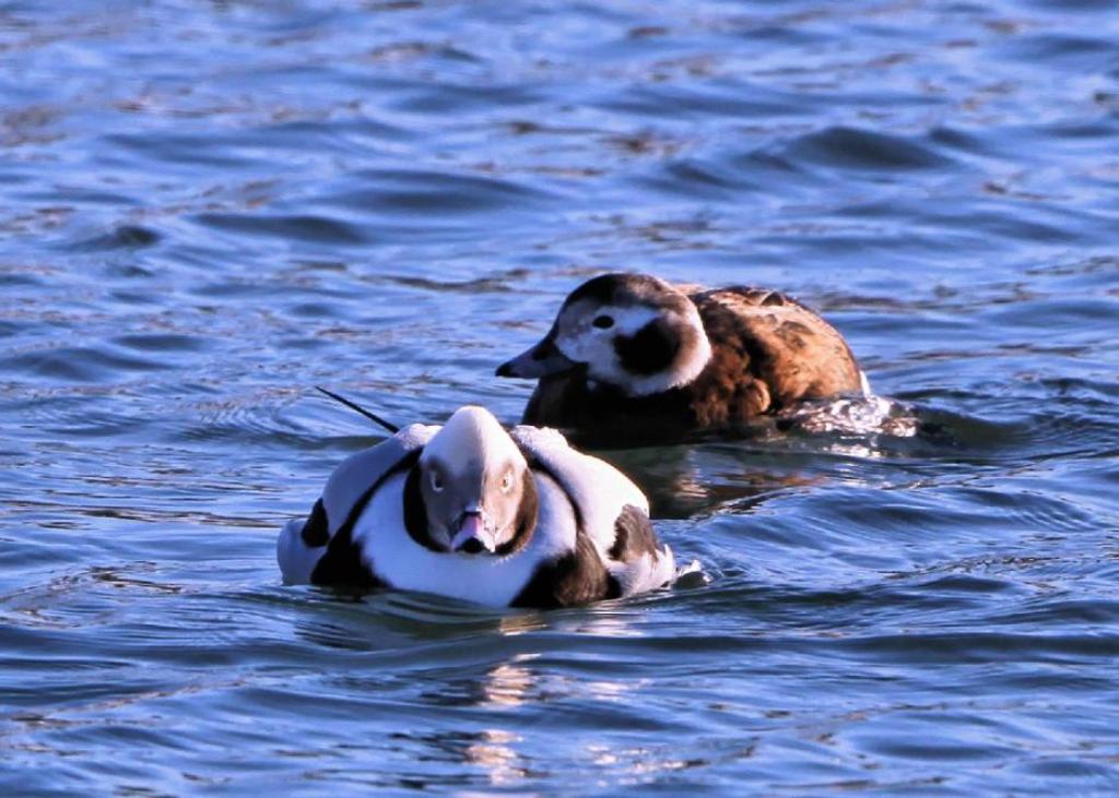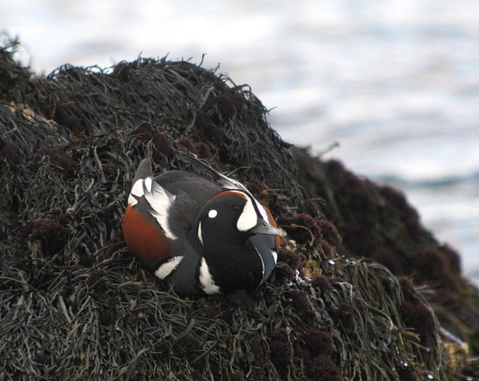 Altra interessante moretta è la Arlecchino, di 45-46 cm. di lunghezza, con un becco diverso da quello di ogni altra specie, per essere, infatti, assai più breve del capo, piuttosto stretto e portante all’apice un’unghia bene sviluppata e alla base due lobi membranosi laterali Durante la buona stagione, il piumaggio dei maschi è prevalentemente azzurro-ardesia, molto più scuro nelle parti inferiori del corpo; su tale fondo spiccano, sul capo, sulle scapole e sulle remiganti numerose macchie,