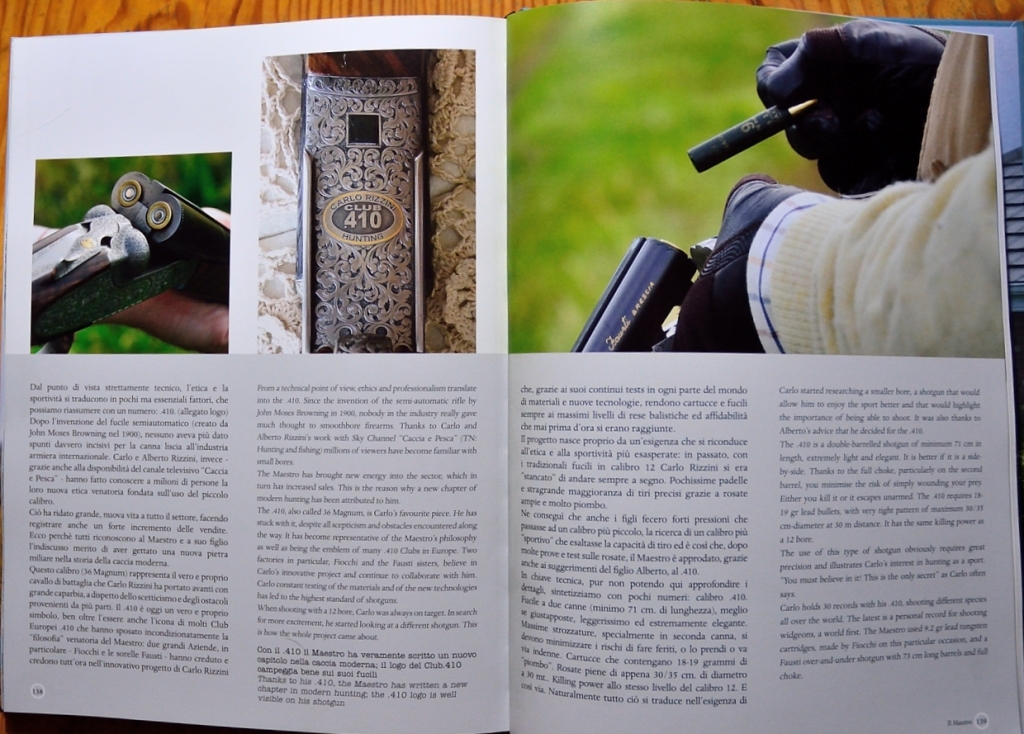 L’etica venatoria, la sportività e il rispetto, ovvero tutto ciò che conta, non sono presenti soltanto nell’ultimo capitolo, dove si descrivono le straordinarie prestazioni dalle prestigiose doppiette e sovrapposti .410 delle Sorelle Fausti e delle cartucce Fiocchi, ma pervadono ogni pagina, ogni parola ed ognuna delle oltre 150 fotografie esclusive che corredano il libro.