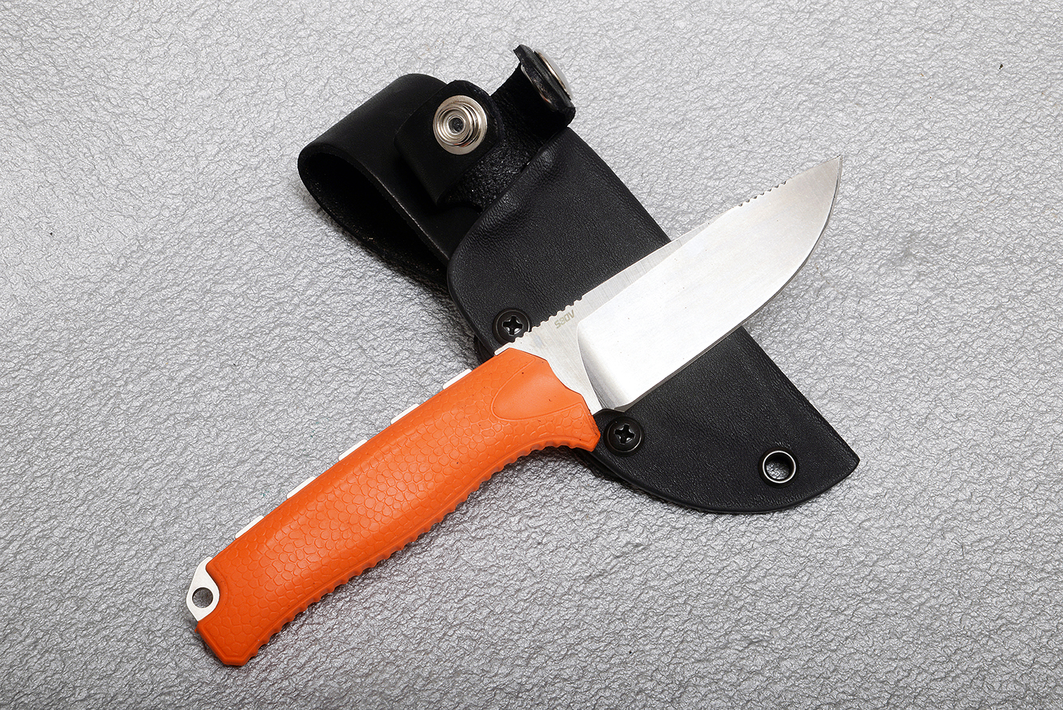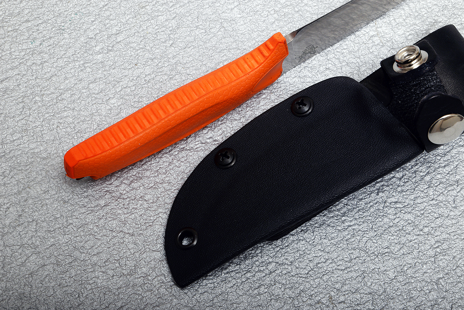 Un coltello di qualità proviene solitamente da un produttore di qualità e Benchmade appartiene a pieno titolo a questa categoria. Fa coltelli robusti, affilati, duraturi, con materiali di prima scelta e un occhio attento alle necessità di chi li usa. Un’attenzione che nel nostro caso incomincia dal colore del manico. C’è anche grigio, per i tradizionalisti, ma quello scelto qui è un vivace arancione, che non sarà rispettoso di una tradizione dimessa ma è utile. Chi caccia all’imbrunire, usa il coltello con luce non proprio vivida. Se il coltello cade nell’erba, non è male sapere che lo si troverà presto perché spicca proprio per il suo colore. Il materiale usato è il Santoprene, un polimero termoplastico brevettato a suo tempo da Monsanto che lascia le caratteristiche fisiche della gomma vulcanizzata ma al contempo presenta la facilità di