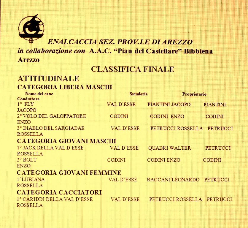 riconoscimento dovuto per atleti indomabili, icone di stile e tipicità, e un incitamento per i tanti giovani, già meritevoli ma con un futuro tutto da costruire. L’assegnazione di questo premio è senza dubbio un fiore all’occhiello dell’organizzazione targata Enalcaccia e guidata dal suo infaticabile presidente provinciale, Jacopo Piantini. E’ testimonianza di interesse culturale prima ancora che agonistico, ed è marchio di qualità di non comune appannaggio.