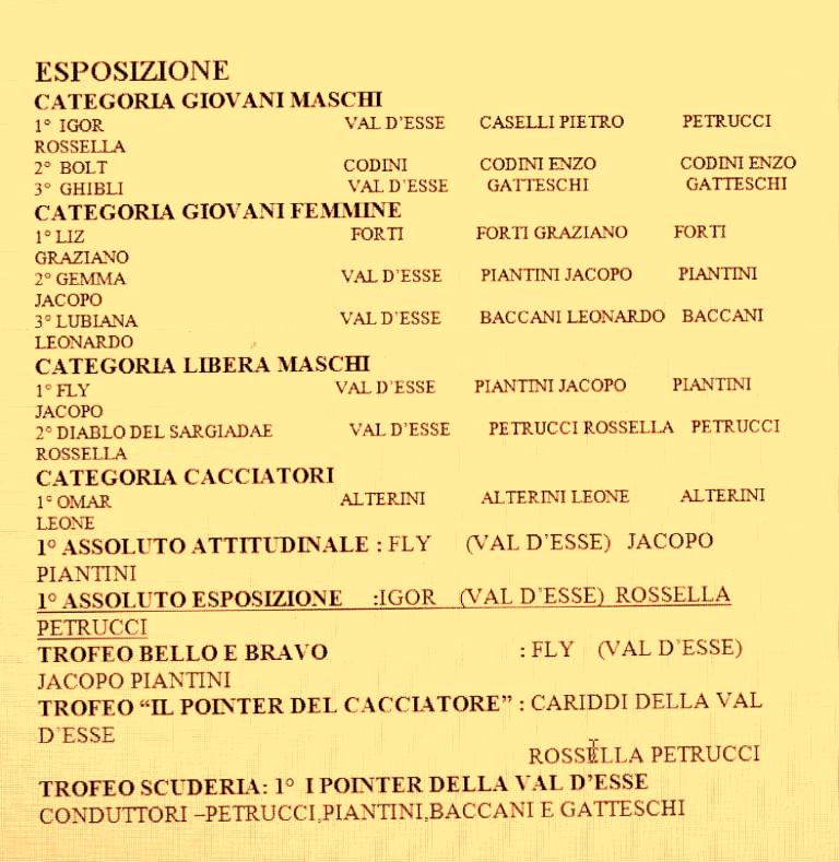 d’Italia dei nostri giorni. Setterman per vocazione, ma innamorato del cane da lavoro di ogni razza, Scipioni ha portato altissima la bandiera dell’italianità in tutta Europa, ricavandone successi immensi e ancor più grande stima e amicizia. Un chianino doc, figlio di una terra, la Valdichiana, che della toscana rappresenta forse il coagulo più vero e completo, il quale fino all’ultimo ha corso sui campi insieme ai suoi amatissimi setter, indomito nello spirito malgrado i colpi di un male cattivo. Ecco dunque che la figura di Ademaro Scipioni, la sua professionalità, la sua classe adamantina, ha assunto nell’animo di tutti i convenuti anche una connotazione di canone a cui ispirarsi per proseguire con una marcia in più verso gli orizzonti ricchi di fascino e d’insidie della cinofilia venatoria.