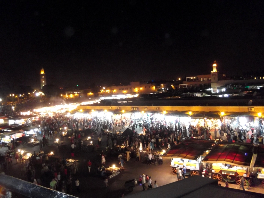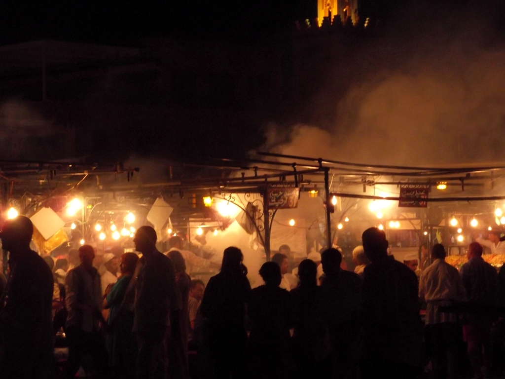 E’ sera ormai. Dalla terrazza del Cafè de France, guardo la movida incessante che popola la Jama el Fna, la “grand place”: brulicare di gente, odori di carne cotta, di spezie, di caldo fine estate africano..