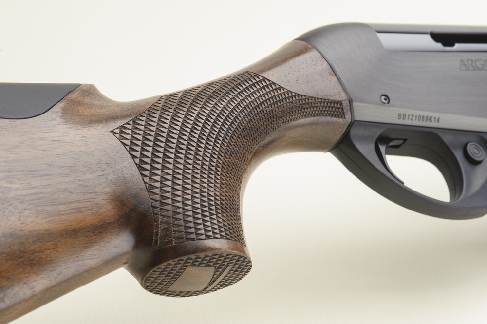 La calciatura della nuova variante di Argo E è realizzata in noce grado 2 finito a olio e caratterizzata dallo zigrino Wood Touch a elementi triangolari che interessa pistola e asta; i calci sono corredati di magliette portacinghia a sgancio rapido e di kit di variazione piega e vantaggio. Il Progressive Comfort oltre all’ammortizzatore di rinculo incorpora anche altre due peculiarità: i naselli intercambiabili in poliuretano speciale e la possibilità di variare a piacimento la lunghezza del calcio su un intervallo di lunghezze fino ad oggi inusitato.