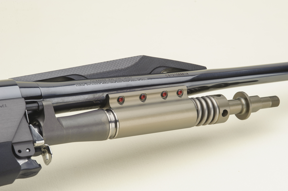 porta dei fori di deflusso dei gas, attraverso i quali sfogano nell’aria i gas in eccesso spillati dal gruppo a presa gas. Allo sparo i gas defluiscono dalla canna attraverso il gruppo presa gas anulare e vanno ad agire sul pistone a corsa.