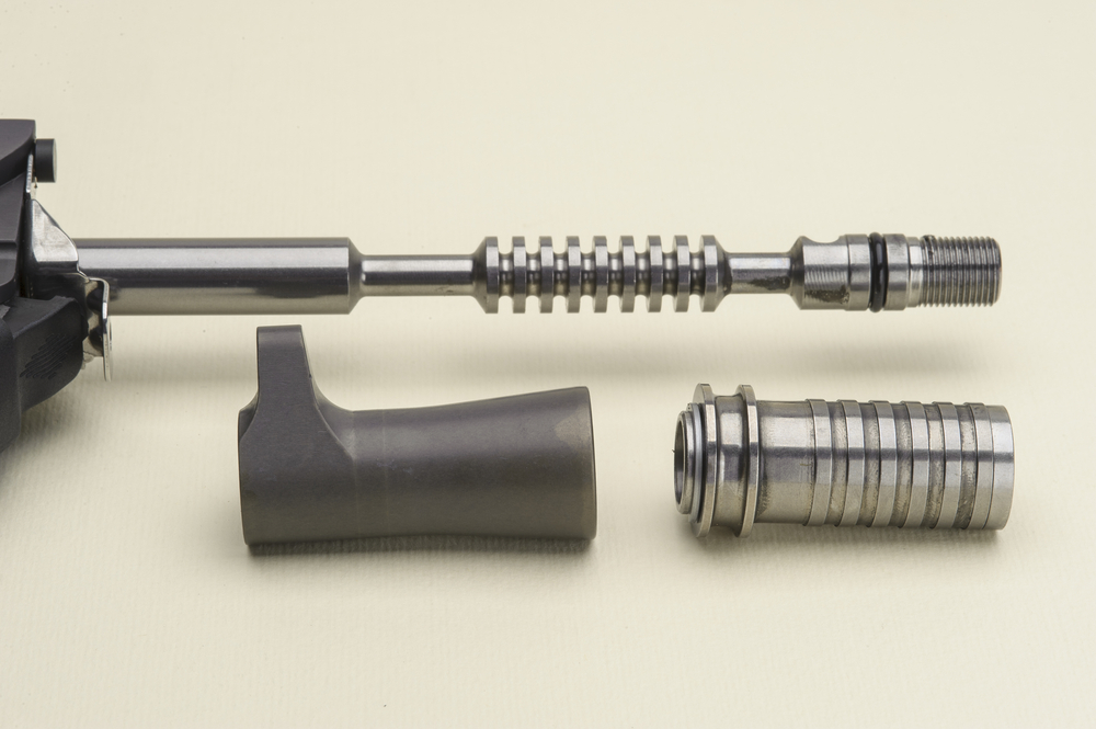in acciaio inossidabile, che entra dentro il gruppo presa gas cilindrico posto sotto alla canna. Il codolo è cavo nell’estremità e porta nella parte anteriore un foro trasversale (coperto dal pistone ad arma in quiete) che attraversa le pareti nella zona cava del codolo. Questa è esternamente filettata per poterci avvitare il cappellotto fissaggio canna, che viene bloccata sul codolo proprio come avviene sui presa gas a canna liscia; il cappellotto di fissaggio è però cavo internamente e filettato esternamente in modo che sullo stesso vada ad avvitarsi il cappellotto fissaggio astina, cappellotto sul quale troviamo anche la base per la maglietta portacinghia anteriore. Questo cappellotto