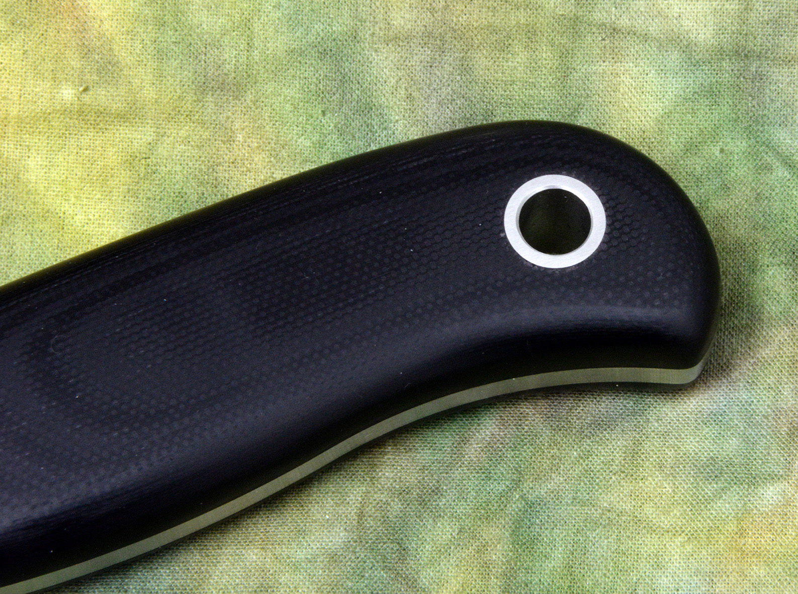 manico è in G10 con un aspetto superficiale simile alla Micarta e reca due rivetti con un foro passante; un altro foro, di piccole dimensioni, è collocato sulla lama per richiamare la caratteristica di Spyderco che è stata oggetto di un brevetto. Incidentalmente, gli spigoli vivi sul dorsi del tallone della lama non sono una carenza di finitura ma una scelta deliberata in quanto consentono di agire su un