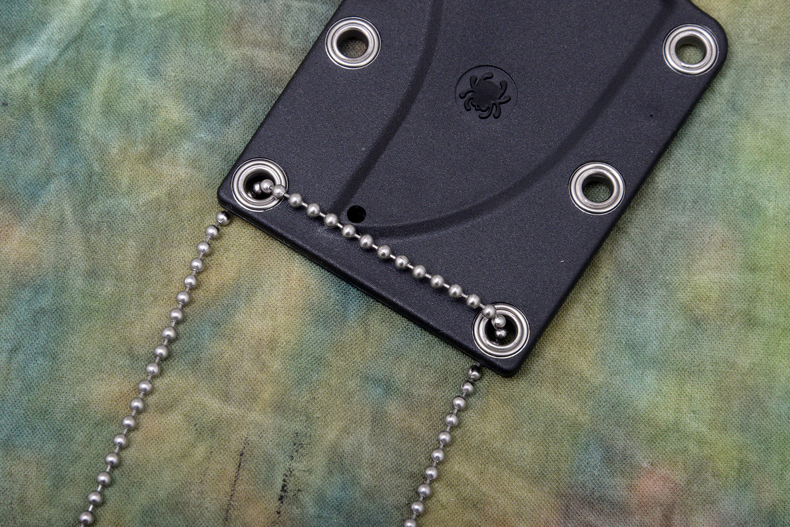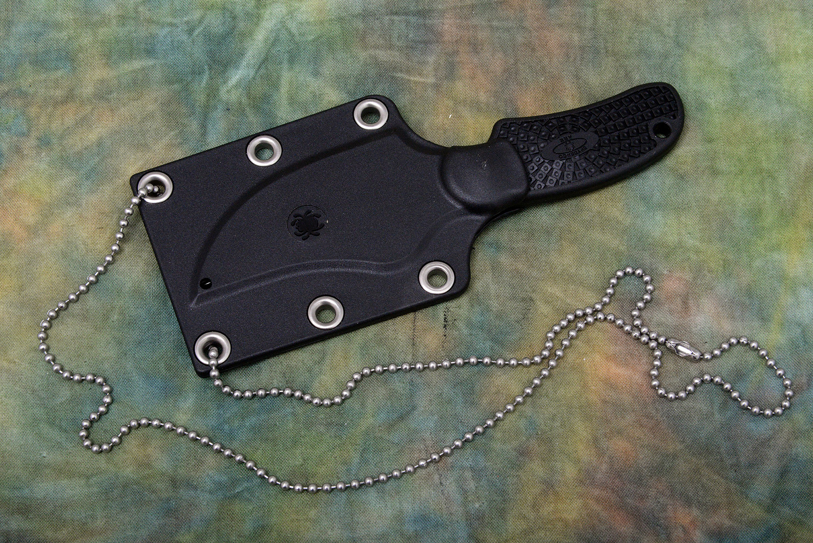 Sam Owens, un dotato coltellinaio custom che iniziò subito a realizzare prototipi. Il coltello doveva essere portato con ogni genere di abbigliamento, ivi compresa la nudità. Logico, quindi, che fosse portato al collo, con un fodero volutamente largo per far sì che non ruotasse e consentisse una rapida estrazione nel giusto verso. Un manico in nylon caricato con fibra di vetro, fuso direttamente intorno al codolo della lama e munito della corrugazione bidirezionale di Spyderco completa il tutto. La lama