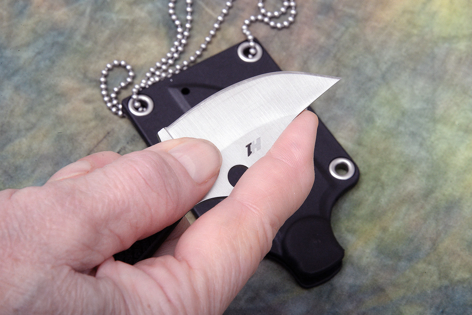 ha un disegno curvo per avere la massima lunghezza del tagliente e il disegno del dorso è tale da realizzare una punta acuminata che si pone in asse col manico. Con un peso di soli 60 grammi, fodero e catenella inclusi, non ci si accorge di portarlo.