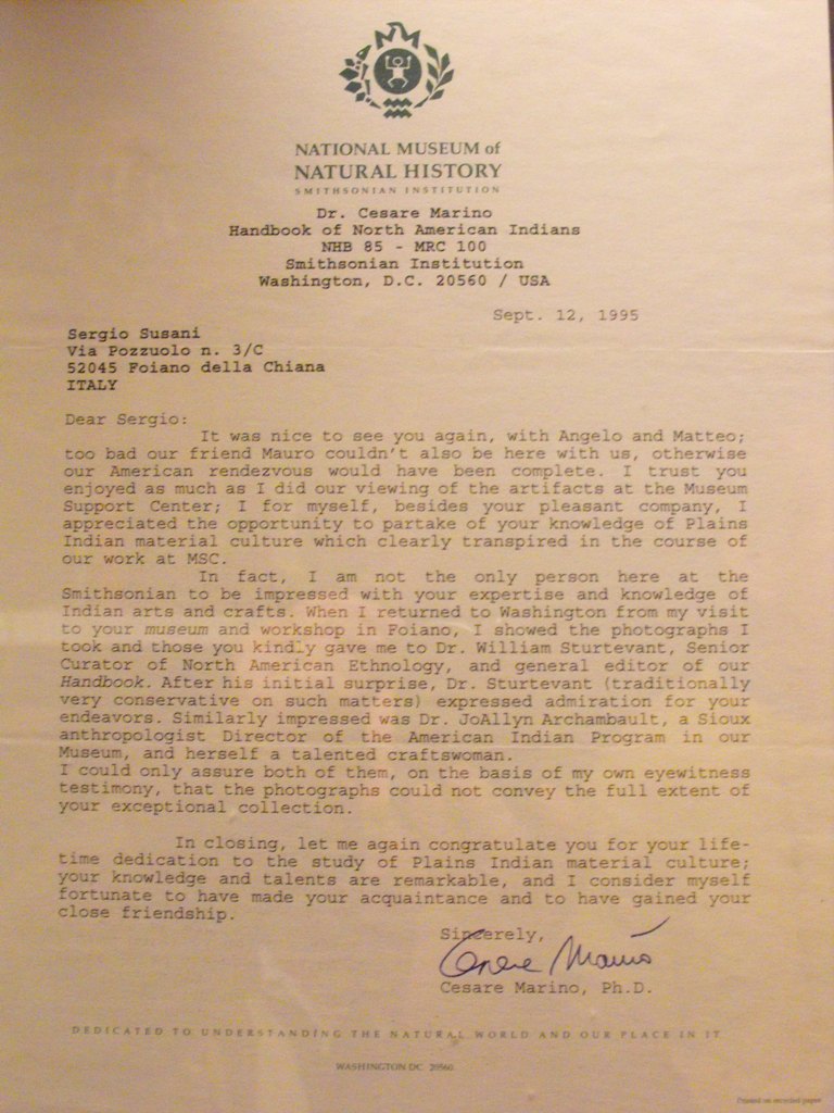 le medesime tecniche utilizzate dalle tribù. Ecco, forse questo è l’aspetto veramente caratterizzante la personalità di Sergio Susani: la totale compenetrazione spirituale in dimensioni lontane da noi, in dinamiche antropologiche assolutamente diverse quando non opposte, in transfert quasi metasifici a ritroso nel tempo e nello spazio. Nella stessa America, adesso, viene chiamato per consulti sulle tradizioni pellerossa o per “expertice” circa la provenienza di un reperto o di un manufatto, ricevendo attestati di stima da consessi scientifici qualificati e perfino da un’istituzione dal prestigio assoluto quale lo Smithsonian Institution di Washington, i cui vertici sono rimasti a dir poco ammirati davanti alla completezza di una cultura in grado di partire dalla nozione e dall’approfondimento teorico più remoto e facilmente approdare nella maestrìa della pratica costruttiva.