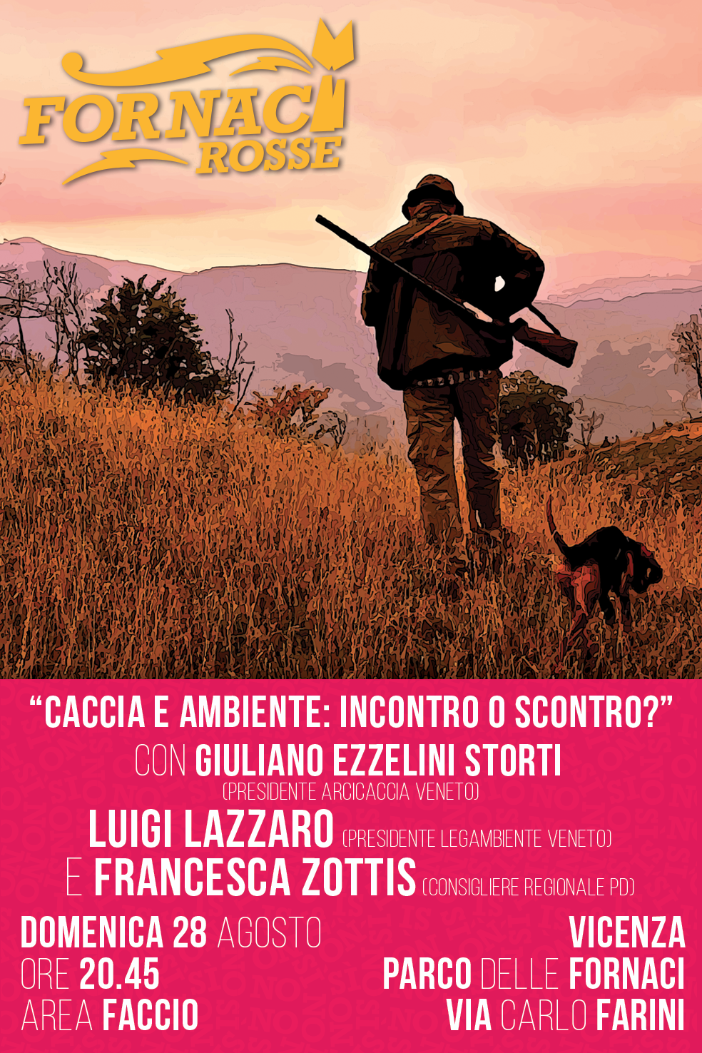 Domenica 28 Agosto alle ore 20:45, nell’ambito della Festa di Fornaci Rosse, che si svolgerà presso il Parco delle Fornaci di Vicenza si svolgerà l’iniziativa “Caccia e ambiente: incontro o scontro?” con Giuliano Ezzelini Storti (Presidente Arcicaccia Veneto), Luigi Lazzaro (presidente Legambiente Veneto) e Francesca Zottis (consigliere regionale Pd). L’iniziativa si presenta di grande interesse e si svolgerà su un palco prestigioso, quindi sarebbe importante un’ampia partecipazione da parte dei cacciatori.