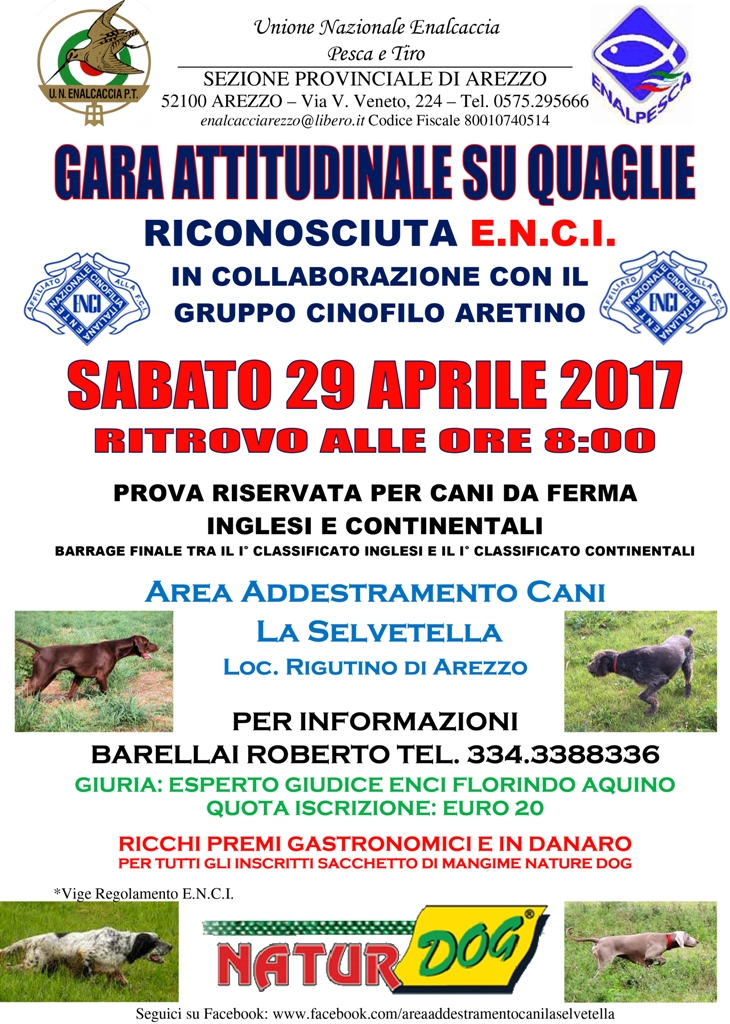 L’Enalcaccia di Arezzo ha organizzato, sui terreni della Selvetella, una prova a quaglie riservata a cani da ferma britannici e continentali. Straordinario barrage finale tra i primi delle due categorie. Per informazioni rivolgersi a: Roberto Barellai tel. 334 3388336.