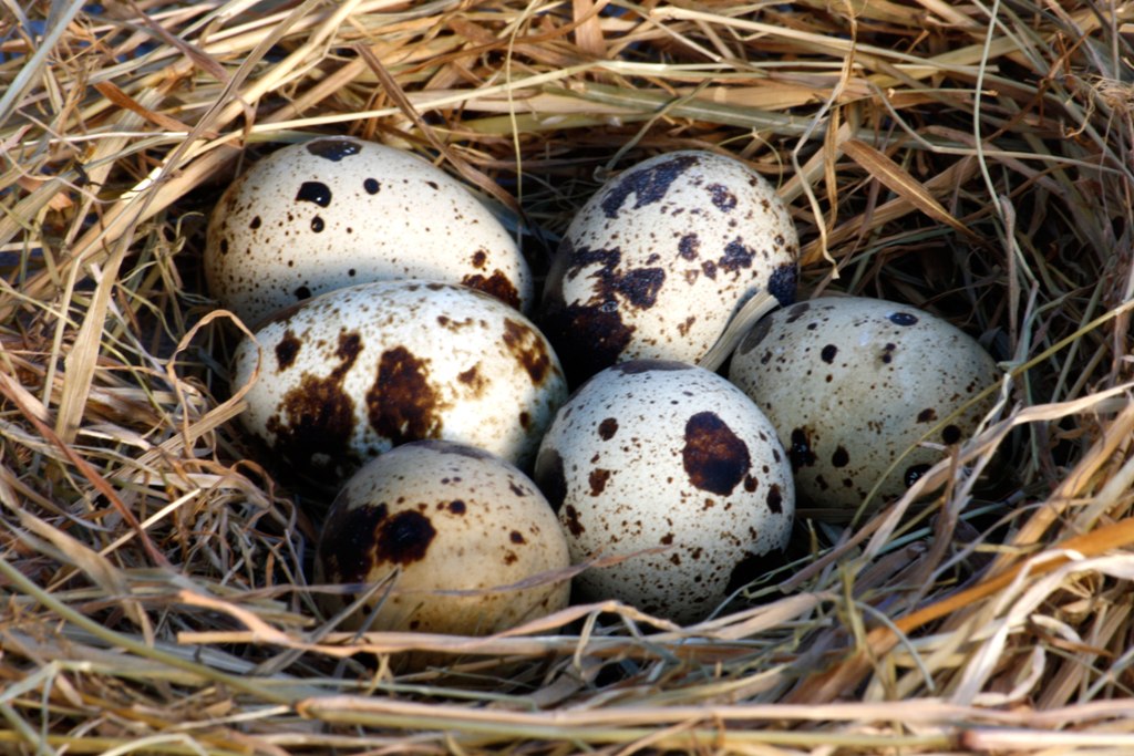 Il ciclo riproduttivo della quaglia comune riveste una grande importanza, sia in rapporto con il meccanismo delle migrazioni, sia nei riguardi della regolamentazione della caccia. La quaglia sembra avere abitudini in genere monogame, a meno che nel suo territorio non si verifichi un’assoluta prevalenza di femmine; in ogni caso, la stagione degli amori che si prolunga da maggio ad agosto è contraddistinta da vivaci combattimenti fra i maschi per la conquista delle loro compagne. Questa fase è accompagnata dall’emissione quasi continua di richiami alti e forti da parte dei maschi, e più deboli e pigolanti da parte delle femmine, che comunque valgono a individuare facilmente la presenza degli uccelli. Avvenuti gli accoppiamenti, ha inizio la sistemazione del nido, generalmente in una piccola depressione del terreno, nascosta fra l’erba o il grano, rivestita e resa soffice da molti e sottilissimi steli sui quali vengono deposte da sette a dodici uova, ma talvolta anche diciotto e oltre. Il colore delle uova è bianco giallastro con larghe macchie,3 x 3,7