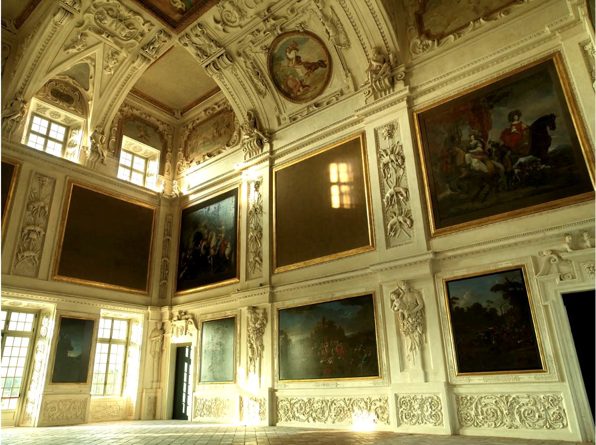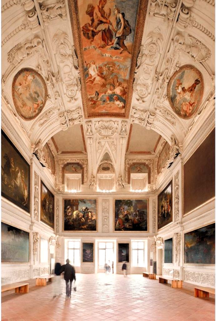 Nell’allegoria celebrativa gli affreschi mitologici, le grandi tele e gli stucchi dovevano evidenziare le virtù celebrate a corte. E’ così che nel registro più basso si trovavano le raffigurazioni delle cacce, dieci tele di Jan Miel: la Caccia al Cervo, alla Lepre, all’Orso, alla Volpe, al Cinghiale, cioè i sei tipi di caccia, e i quattro momenti principali della caccia al cervo la Morte del cervo, l’Andar al bosco, l’Assemblea, il Lasciar correre, la Curea (oggi conservate presso il Museo Civico d’Arte Antica di Palazzo Madama). Visualizzavano lo “svago” venatorio della corte e simboleggiavano il suo prestigio come si evince dal fatto che sono volutamente riconoscibili alcuni personaggi della corte. Lo sguardo del visitatore può ora salire al secondo registro, a sette dei dieci enormi ritratti equestri dei duchi e della corte un tempo presenti, firmati da vari pittori al servizio dei Savoia,