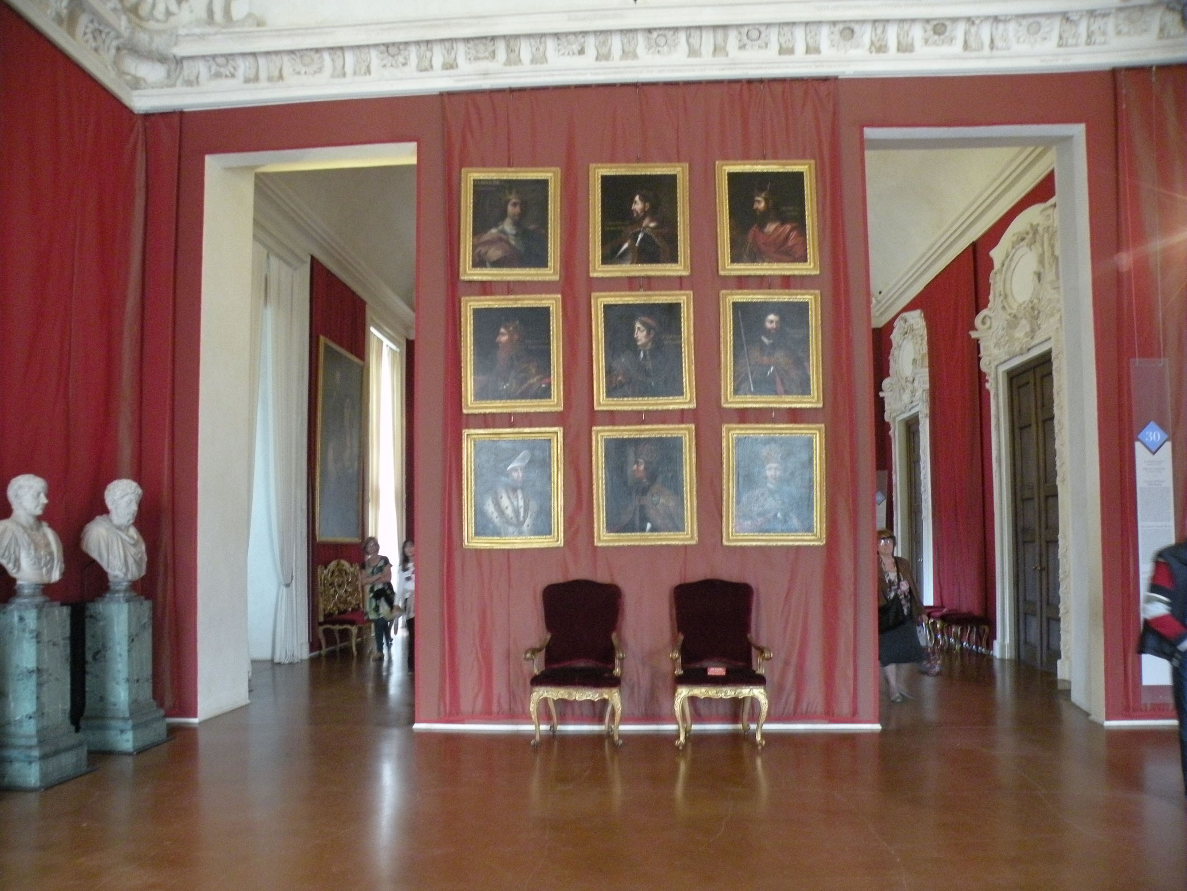 complesso ornavano le pareti della reggia seicentesca: Le tematiche, come abbiamo visto, erano sia di carattere mitologico, a richiamare le iconografie affrescate e quelle a stucco, sia appartenevano al genere della ritrattistica: 42 ritratti dinastici dei re d’Inghilterra, 36 dei re di Francia, 40 degli imperatori oltre naturalmente a quelli dedicati agli antenati di Casa Savoia ospitati in due anticamere; ma non solo: la Venaria, al suo interno, come uno scrigno prezioso offriva anche arazzi che purtroppo fanno parte dell’arredo perduto, specchiere, tavoli da muro, sgabelli, inginocchiatoi, tappezzerie di damasco etc…