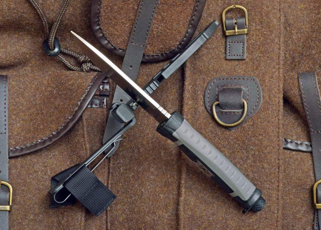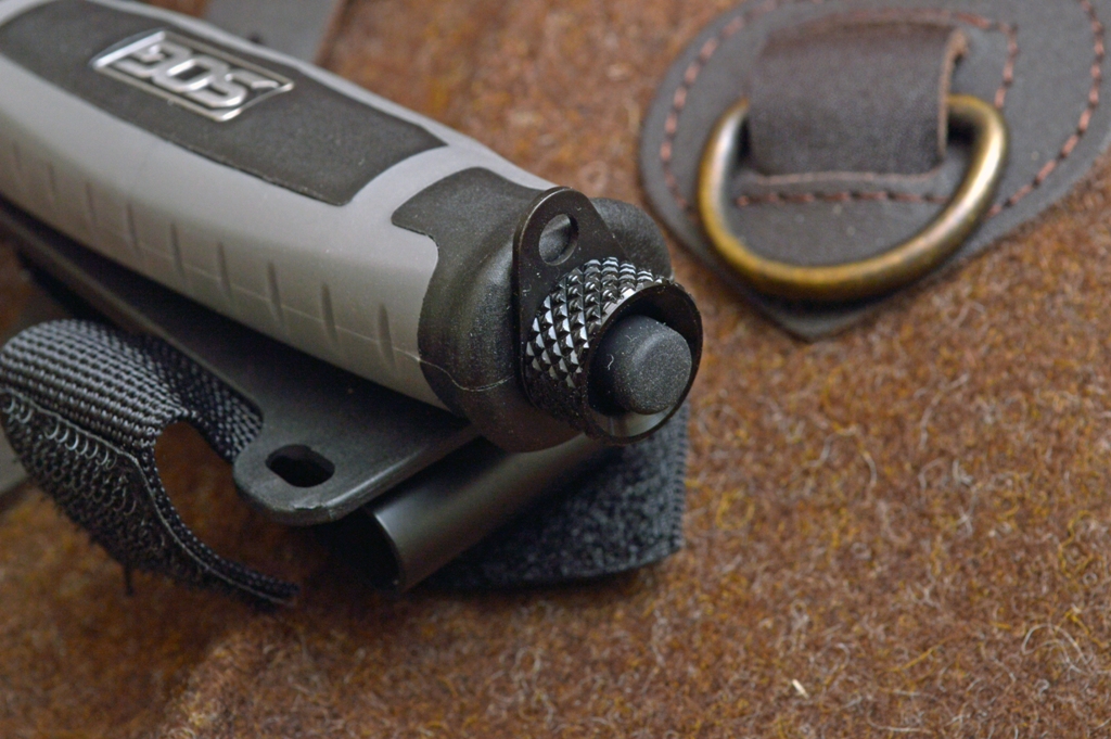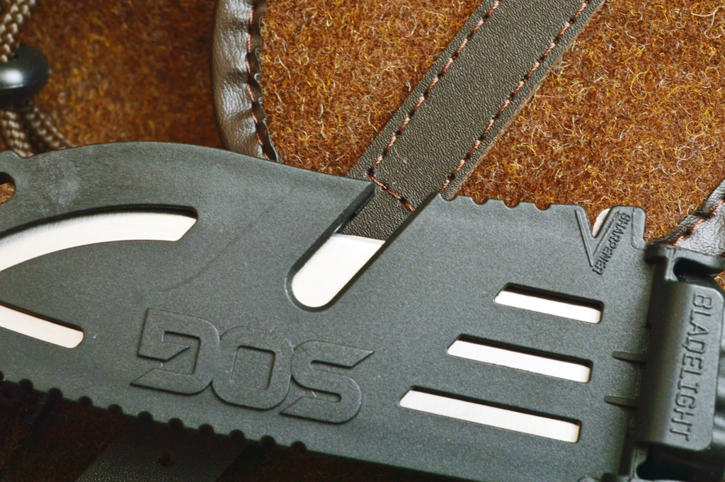 Un taglio nel fodero, che lascia sporgere un breve tratto del filo, serve per tagliare cinture o paracord ma può anche fungere da gut-hook d’emergenza. La lama è in acciaio 8Cr13MoV, un acciaio al Cromo-Molibdeno usato da numerosi coltellinai custom, che lo apprezzano per le sue qualità Il manico è in materiale plastico ben grippante, caricato con fibra di vetro, di color grigio per il Camp e rosso arancio