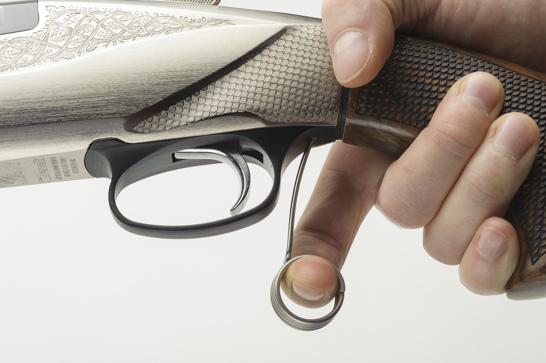 Massima sicurezza e affidabilità totale: a questi due principi risponde il progetto di bascula che ha preso poi corpo nel nuovo sovrapposto di Benelli. Essa à elegantemente incisa ma anche sicura nel tempo nelle sue chiusure con un congegno in grado di assorbire anche pressioni più elevate di quelle di norma contemplate dal calibro dell’arma e dovute a munizionamento fuori standard o deteriorato. La chiusura dell’828 U, assicurata da una piastra in acciaio che inferiormente porta un aggetto orizzontale foggiato a culla e dotato di due risalti posti uno per lato, sarà sempre affidabile nel tempo proprio perché il meccanismo brevettato, con la piastra in ergal direttamente allegata al monoblocco, annulla lo stress meccanico sulla bascula. Ad arma in chiusura, infatti, la piastra impegna inferiormente il gruppo con l’aggetto orizzontale mentre la sua parte superiore entra in una sede ricavata sotto alle due appendici superiori del gruppo canne. Ecco che il vivo di culatta è letteralmente sigillato e di conseguenza l’insieme piastra-canne costituisce un’unità a se stante. I perni di rotazione non lavorano durante lo sparo ma sono comunque super resistenti e facilmente sostituibili in quanto parte integrale di piastrine in acciaio alloggiate nei fianchi della bascula. Una tecnologia veramente innovativa nel campo dei sovrapposti che fanno del 828 U un fucile stabile e duraturo.