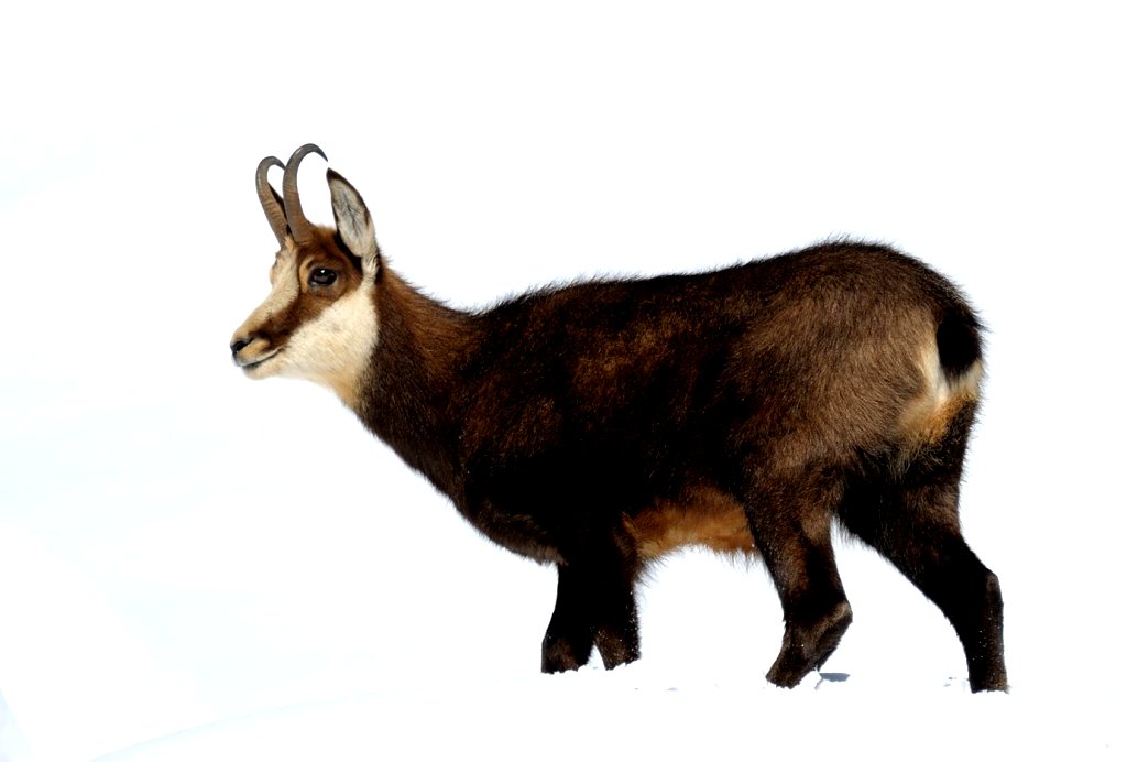 maschi, nei quali maggiore è anche lo spessore, possono anche raggiungere i 30 cm. Alla base delle corna sono ben visibili piccole escrescenze anulari che vanno distanziandosi l’una dall’altra verso la parte apicale. Ogni anno si forma una nuova escrescenza sicché il loro numero denuncia con sicurezza l’età dell’animale. Il corpo del camoscio, nell’insieme forte ed elegante, è sorretto da agili e lunghe zampe; non si notano differenze nei due sessi, né per forma né per colore. La tinta del mantello e la qualità del pelo che lo costituisce, variano, invece, nelle diverse stagioni. Formano il manto, peli ruvidi e lanugine di lunghezza uniforme su tutto il corpo, ad eccezione della regione dorsale che mostra un accenno ad una specie di criniera. Nell’inverno, la lanugine aumenta