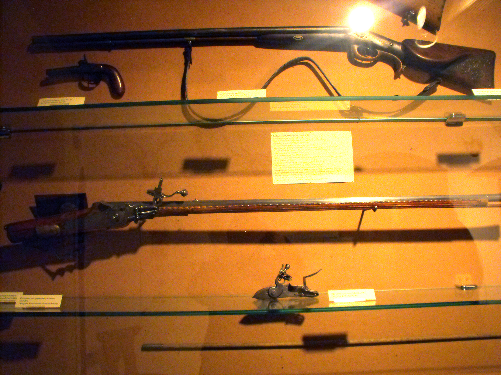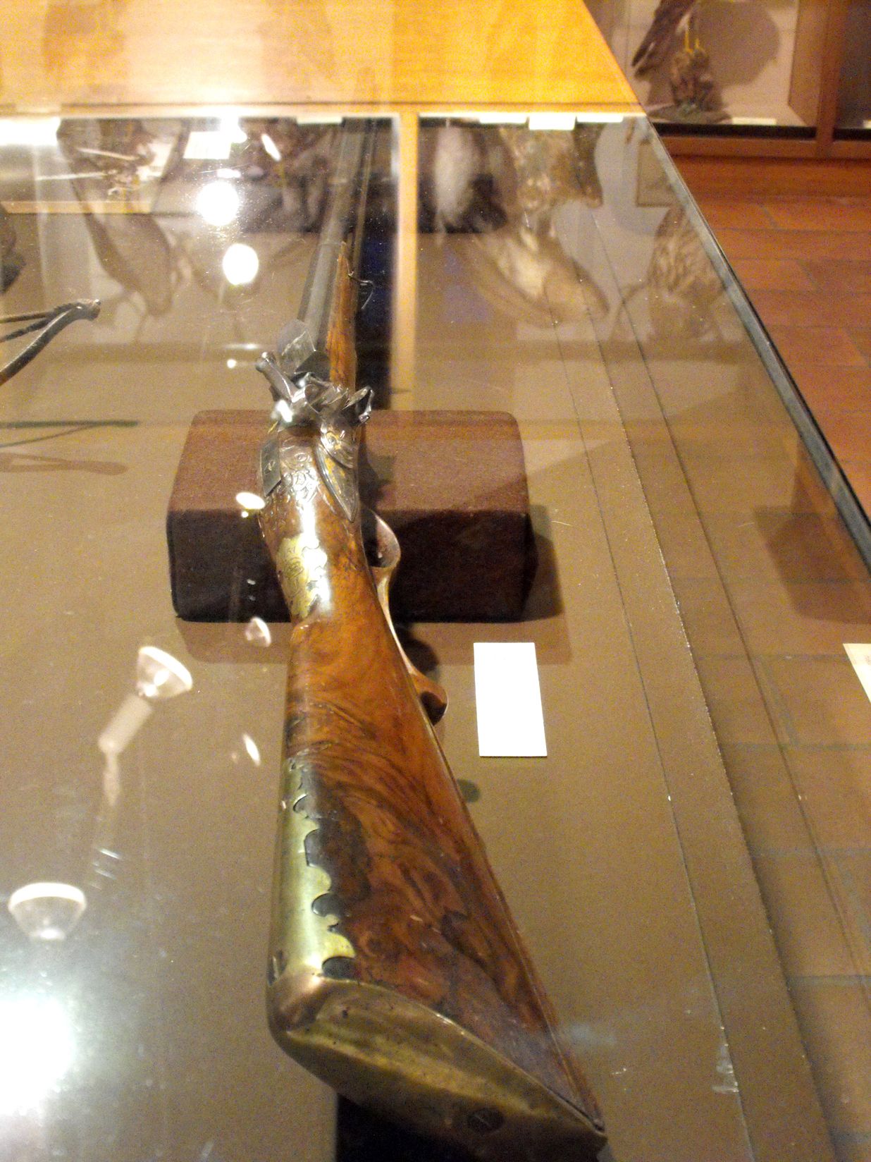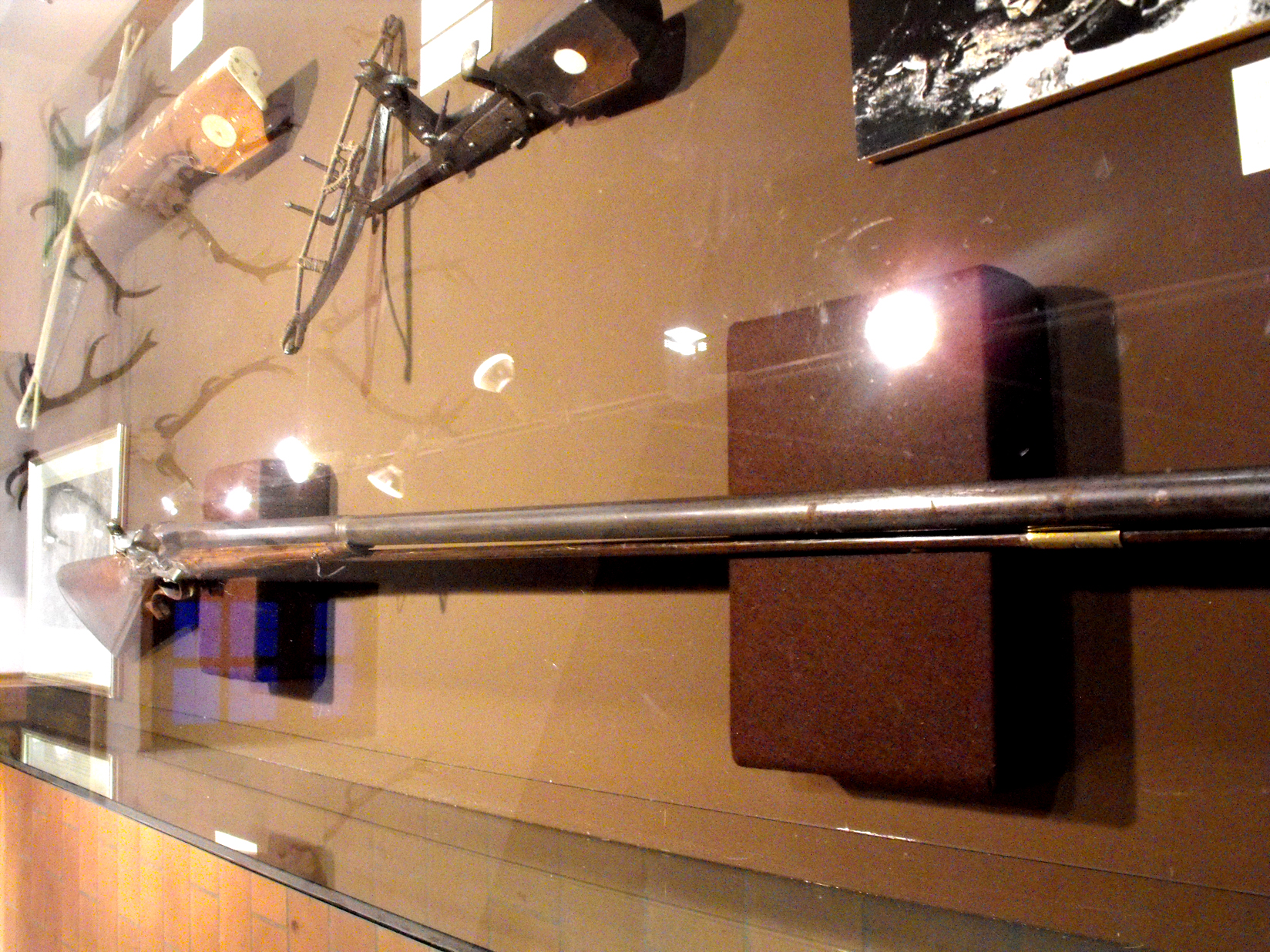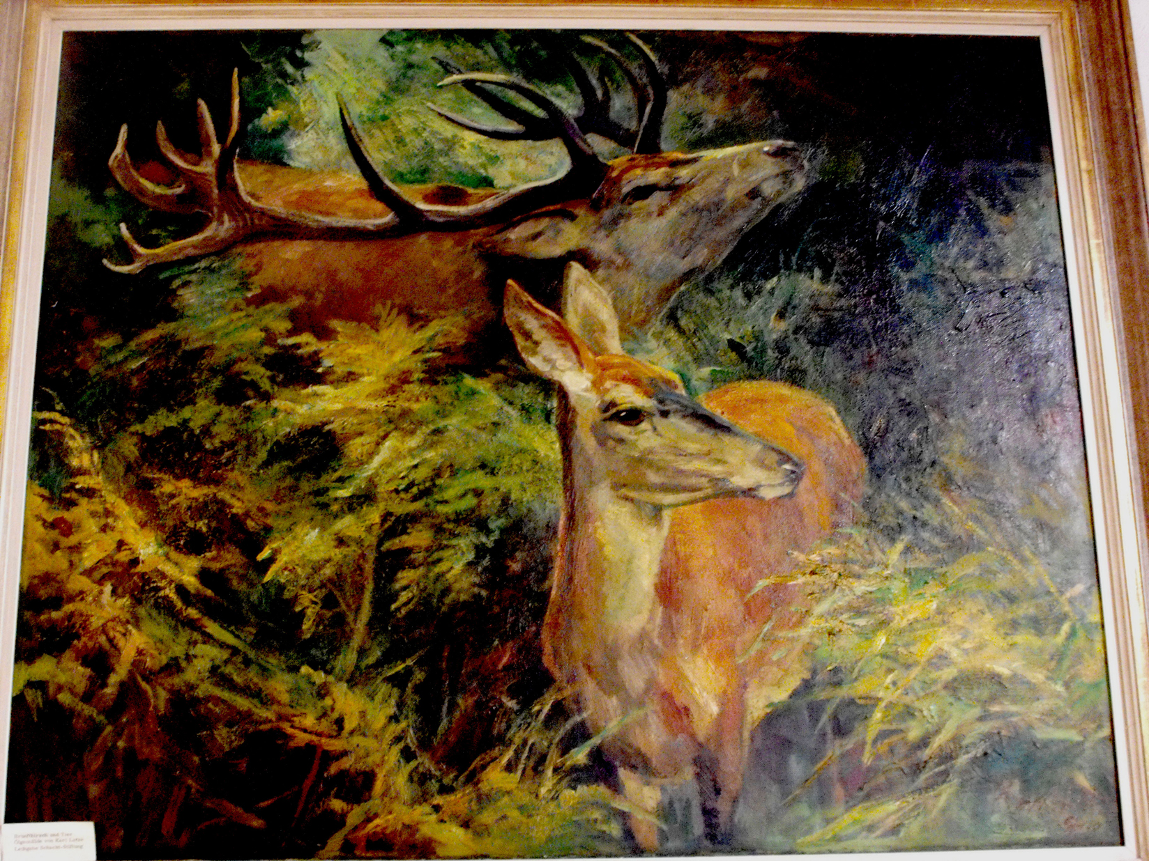 Un permesso di caccia granducale biancheggia fra antiche formelle in avorio istoriate con storie di cani e cacce meravigliose; la copertina verde e oro di un manuale dell’ottocento accompagna un portachiavi fatto con la stanga di un capriolo; una ceramica da stufa prelude ad un magnifico studio di daino da trofeo mondiale, eseguito nel 1960 da Karl Lotze, uno dei maestri contemporanei dell’arte figurativa venatoria, del quale possiamo ammirare anche altre opere, fra cui delle grafiti e un olio, sempre con il tema dei grandi selvatici ricorrente e preferito. L’espressività dei soggetti, la correttezza delle proporzioni senza essere didascaliche, il tratto pulito rendono
