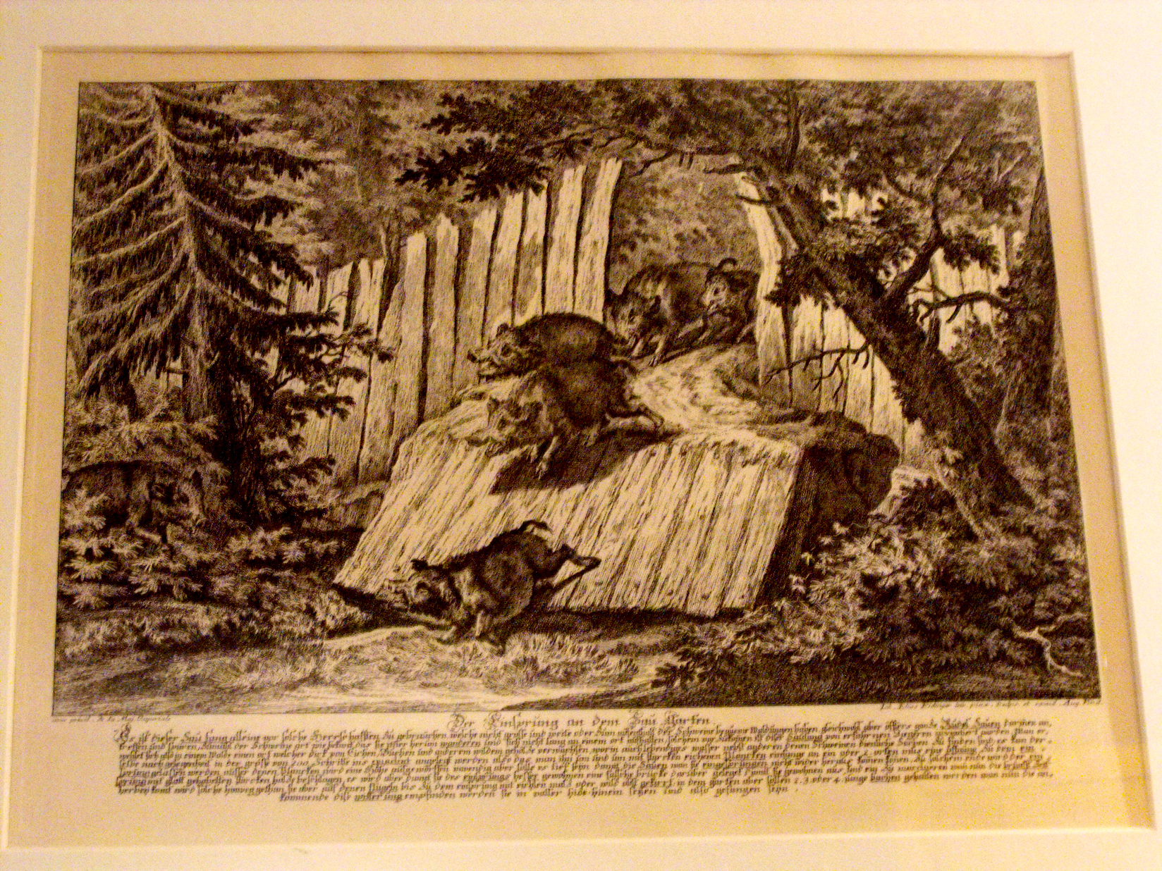 un’incisione del maestro di tutti i maestri dell’arte dello stiletto: Johannes Elias Ridinger. E’ una stampa originale coeva, così come due delle altre quattro, e nonostante siano trascorsi trecento anni emana ancora una forza di penetrazione ineguagliabile. Mi rendo conto che la sola vista di queste opere vale il sobbarco del viaggio per il castello di Falkenstein. Indugio su ogni particolare anatomico, sulle piante e il paesaggio, e osservo gli occhi vivi di quelle bestie irsute, rese creature immortali dalla mano e dal cuore di un genio. Mi muovo per le sale osservato da una moltitudine di occhi.