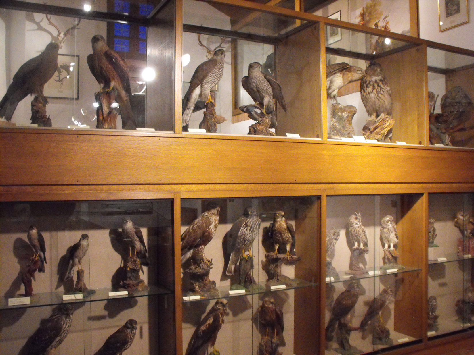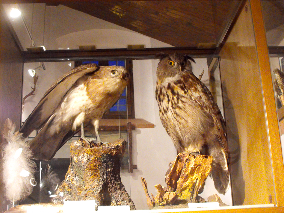 Mi stacco da lui, e davanti a me ci sono le teche di un settore dal sapore leggendario. Livree di astori e falconi si susseguono a decine, raccontando ognuno la sua storia di predatore dell’aria o di nobile compagno di avventure per chissà quale fortunato cacciatore. E poi gufi, poiane, civette nonché cappucci, logori, guanti e ogni altro attrezzo che serviva, e serve ancora, all’ “arte venandi cum avibus”, per dirla insieme a Federico II che otto secoli fa ne codificò mirabilmente i principi.