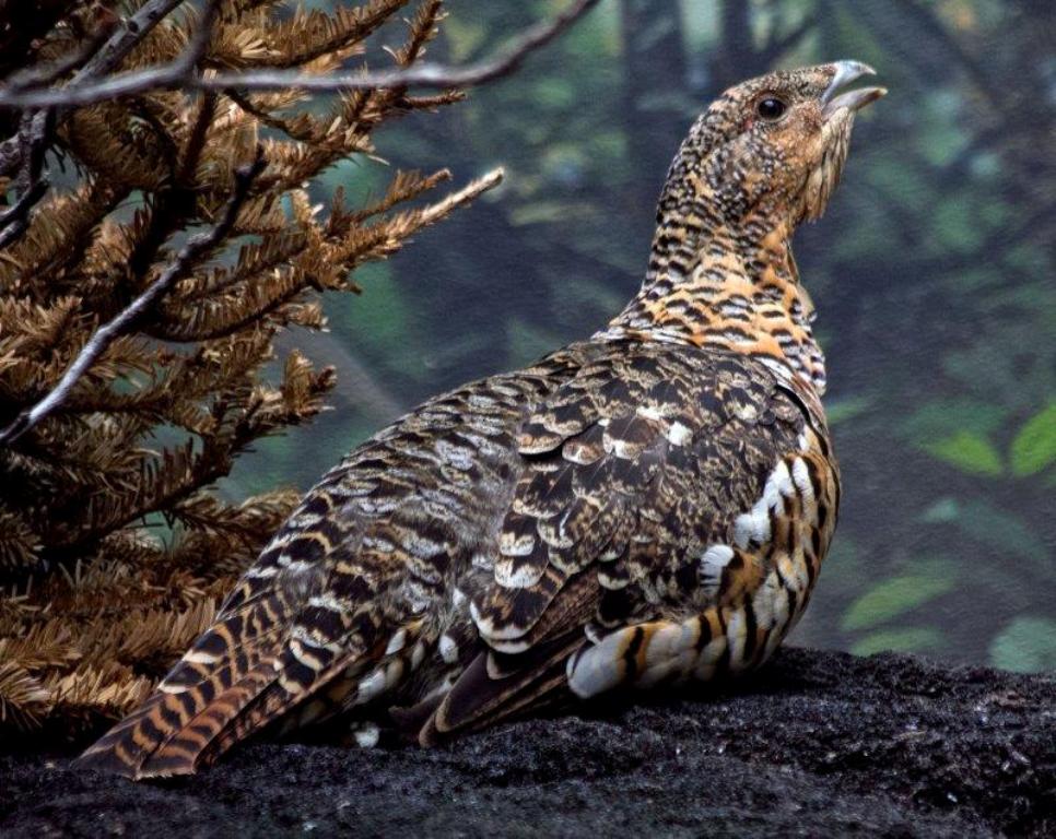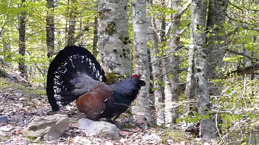au brun à mesure qu’on descend sur le dos et vers la queue, avec une poitrine vert foncé à reflets métalliques alternativement bleus et violacés, couleurs rappelant un peu celles du faisan versicolore ; l’oeil est enchâssé, comme chez les faisans, dans une zone d’un bel écarlate exempte de plumes, et qui se déta-che violemment comme un disque de feu au milieu des tonalités sombres de la tête et du cou. La queue est longue, épaisse, composée de grandes plumes brunes susceptibles de se relever en éventail comme chez le paon et le dinde quand l’oiseau fait la roue. Quelques taches blanches sont parsemées sur les rémiges des ailes, les plumes de la queue et le dessous du ventre. Enfin, comme signe caractéristique, une barbe noire lustrée pendant sous le bec, lequel est couleur d’ivoire jauni, fort, tranchant, capable, en un mot, de déchiqueter les cônes des résineux pour y chercher les graines dont l’oiseau fait sa nourriture. Les pattes sont courtes, robustes et couvertes entièrement de plumes ou plutôt de poils jusqu’aux pieds. Voilà pour