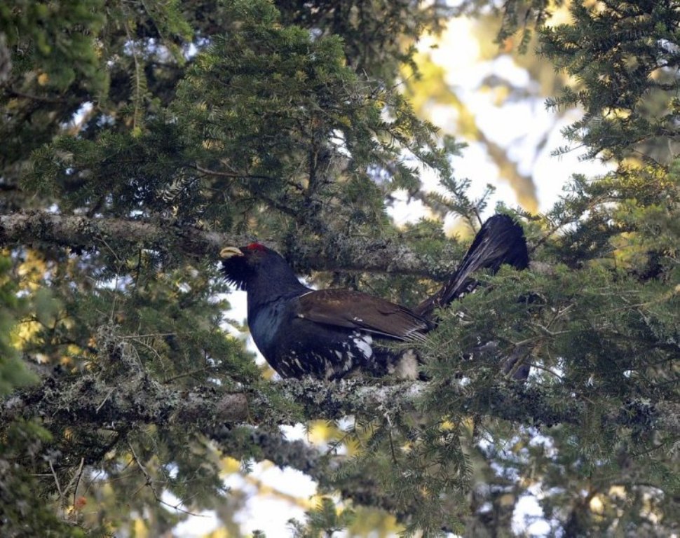 C’est d’abord le grand tétras ou coq de bruyère. appelé aussi en Allemagne et en Italie coq saurage, coq de montagne, ou gencore, coq de bois, magnifique oiseau, le plus beau gibier de nos forêts, dont l’espèce disparaîtra avant peu si on ne se hâte de prendre des mesures énergiques en vue de sa conservation. Et ce sera grand dommage : -de la taille d’une dinde (il arrive à peser 15 et 16 livre, da parfois 1 mètre de longueur de la pointe du bec à l’extrémité de la queue;, fier, robuste, majestueux, de formes harmonieuses, tout en étant puissantes, il est, en outre, revêtu des plus riches couleurs. La tête et le cou sont d’un beau noir lustré qui passe
