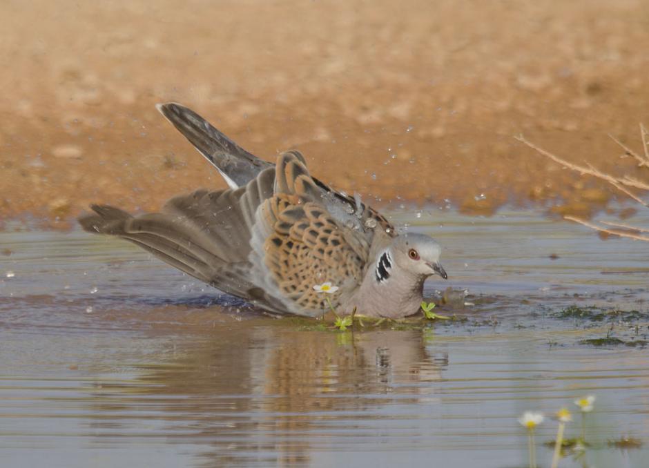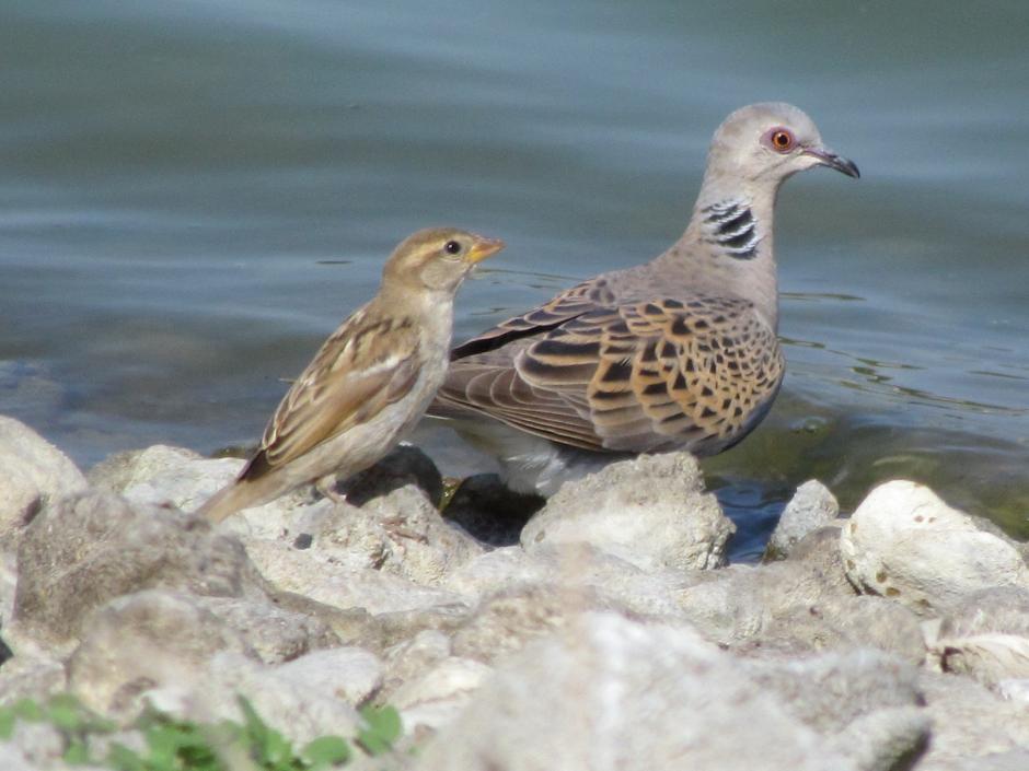 piante e volano verso i terreni del pascolo. Arrivati a destinazione, procedono rapidi e affaccendati su terreno alla ricerca di semi, germogli, molluschi e altri piccoli invertebrati che inghiottono insieme con piccole quantità di terriccio per favorire, nel gozzo, la più completa triturazione del cibo. Nelle restanti ore della mattinata i gruppi, se indisturbati, si dedicano ai giochi collettivi e al canto prima di avviarsi tutti insieme all’abbeverata. Nel primo pomeriggio si ripete ancora l’alternanza del pascolo e dell’abbeverata sino al tramonto quando tutti gli uccelli fanno ritorno nel fitto dove sceglieranno il luogo del riposo notturno. Sebbene la tortora rimanga sul terreno e su esso prevalentemente si sposti, il suo volo è rapido, mai però condotto troppo lungo tranne che nel corso delle migrazioni, ed è intervallato da lunghi e frequenti riposi sui rami, o sui fili elettrici, accompagnato quasi sempre da un armonioso tubare.