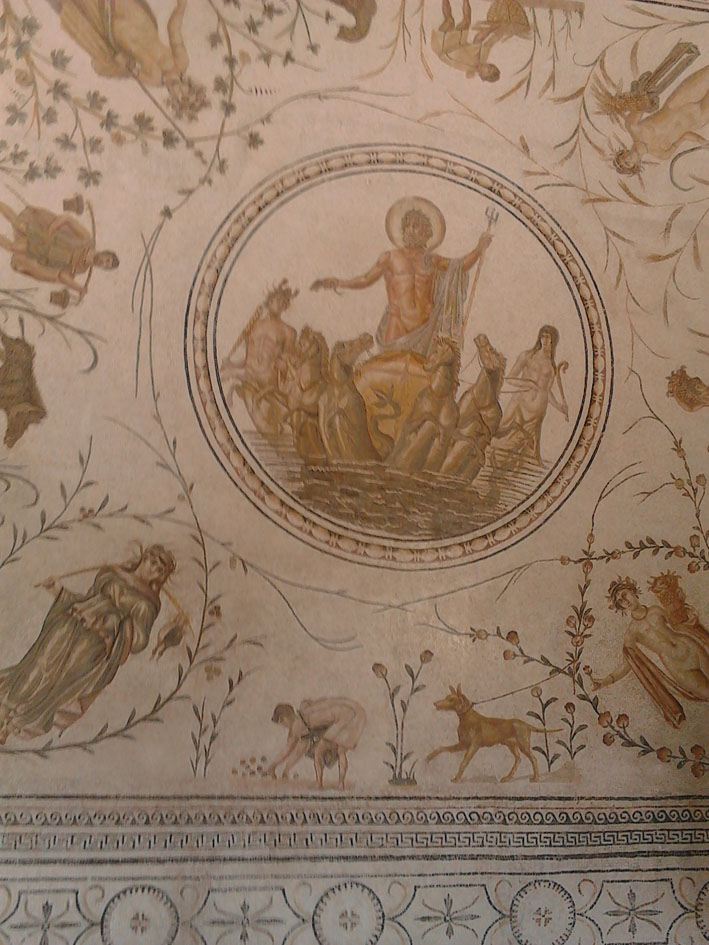 il Trionfo di Nettuno, si tratta del pavimento di un atrium. Il mosaico risale al II d. C. secolo e proviene da Chebba; a destra, Cinghiale braccato in fuga