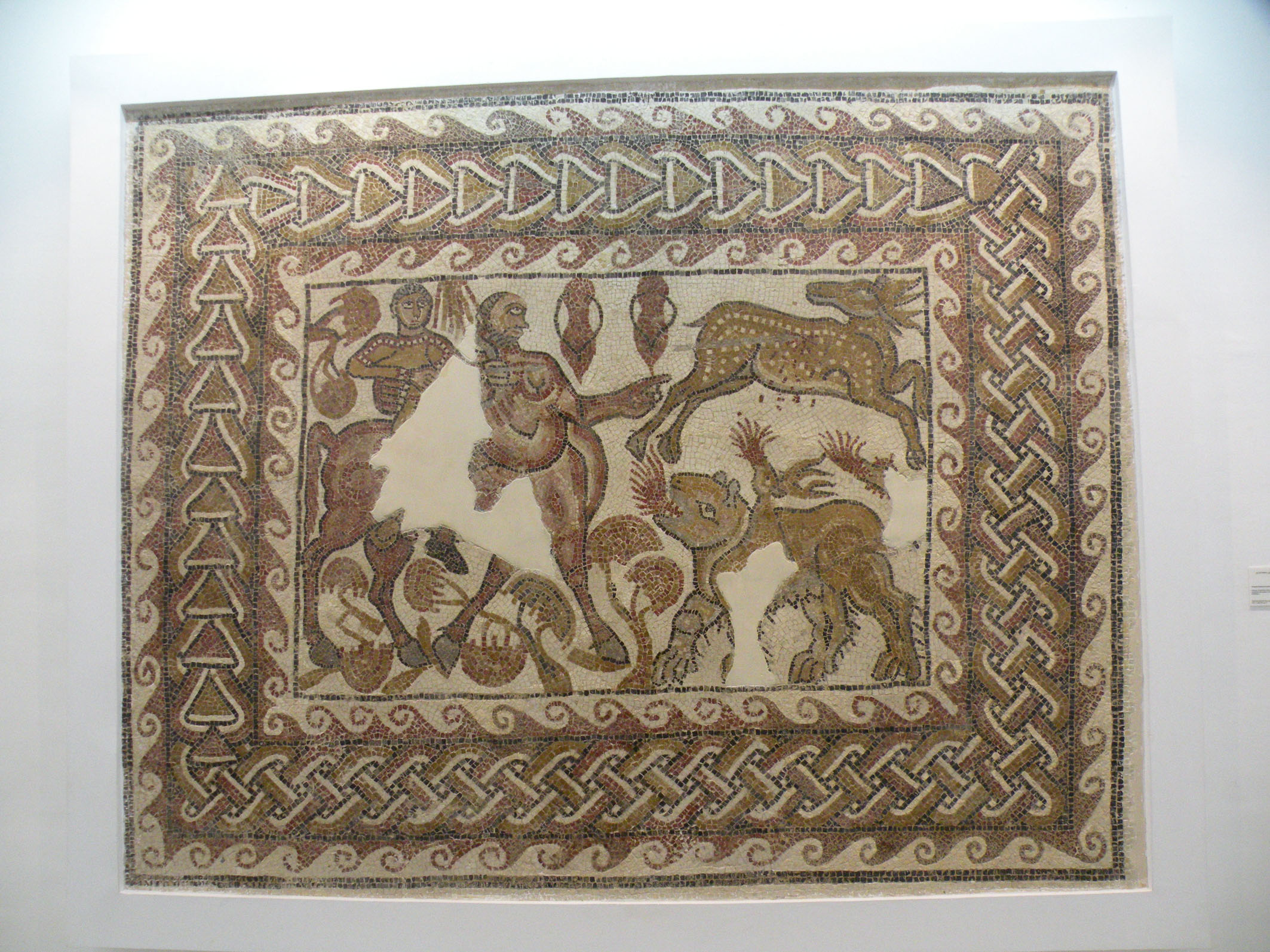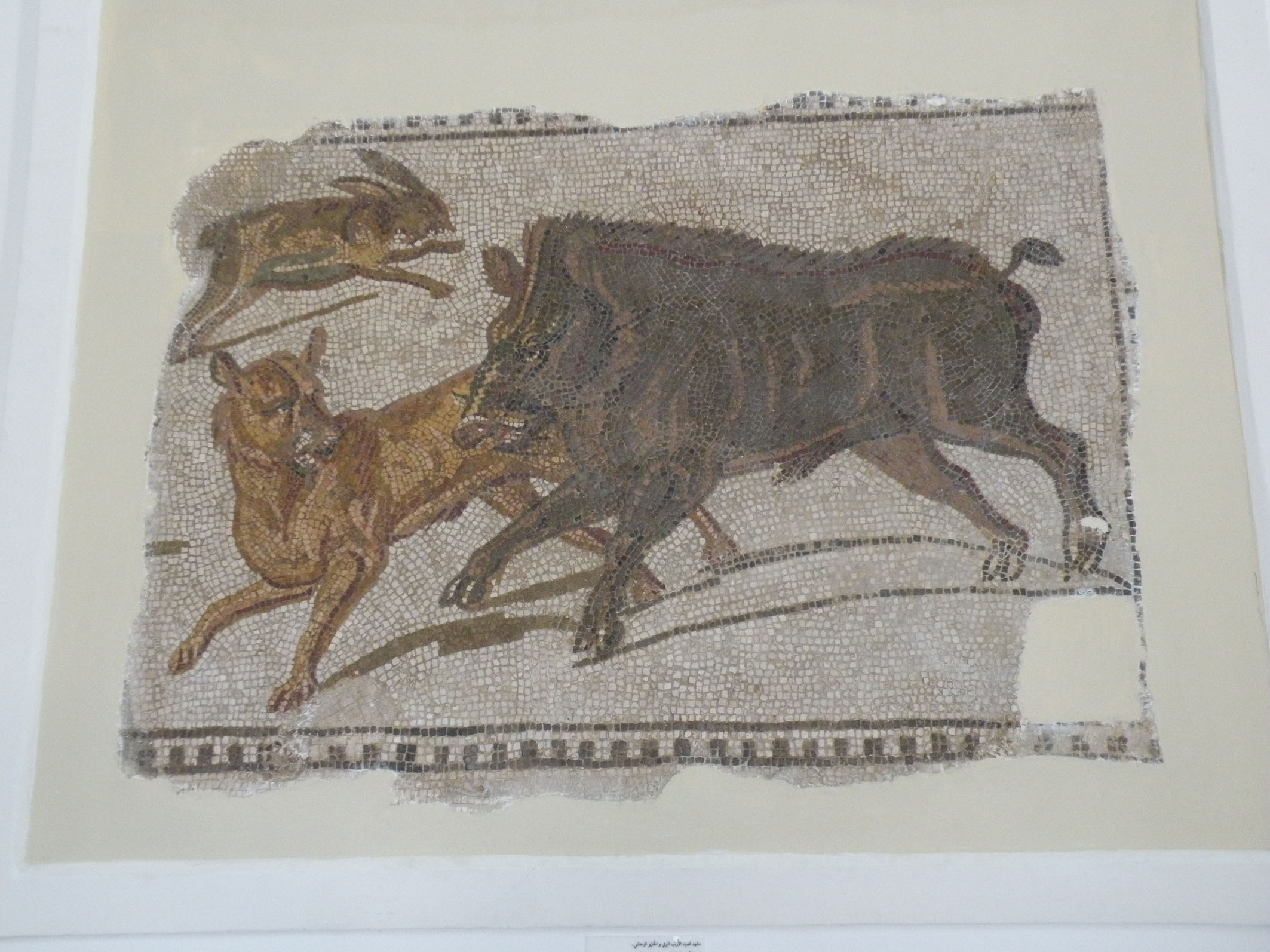 inequivocabilmente un mosaico rinvenuto ad Ippona (Algeria). Spesso si arrivava a dare fuoco ad un’intera zona di macchia per spaventare le prede e farle uscire allo scoperto, se ne lamenta in uno dei suoi scritti, per esempio, Silio Italico, avvocato e poeta del I sec d.C.. Nel discorso indirizzato a Commodo Giulio Polluce, retore del II sec. d.C. descrive come deve essere l’abbigliamento di chi si reca ad una battuta di caccia: tunica leggera di un colore non chiassoso, né bianca per non attirare l’attenzione dell’animale (i primordi del mimetismo). Indispensabile sostituire i tradizionali sandali con calzari che proteggessero tutto il piede e lo sostenessero. Troviamo anche di ciò pieno riscontro in più di una raffigurazione contenuta al Bardo. Un tesoro iconografico quindi, quello ospitato nel prestigioso museo tunisino, che ci testimonia come per certi aspetti i nostri antenati cacciatori ci assomigliassero più di quanto ci si aspetterebbe, considerati i 2000 anni che ci separano da loro.