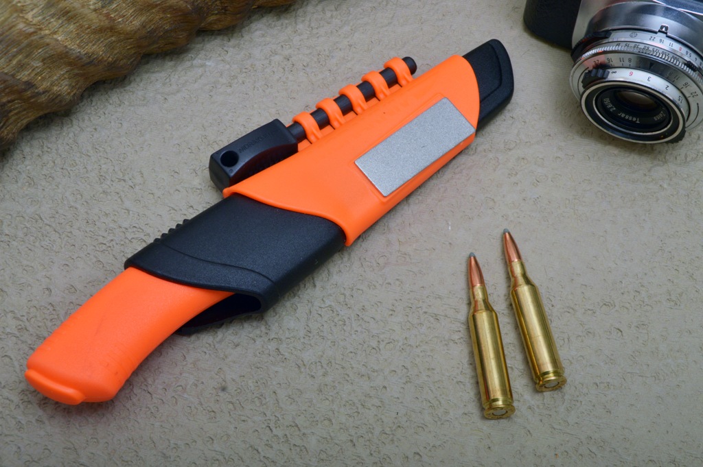 Una lama in acciaio inossidabile, trattata termicamente secondo un procedimento proprietario che è un rigoroso segreto industriale, caratterizza il coltello di cui ci stiamo occupando. Il manico, ben grippante ancorché quasi liscio, è caratterizzato da uno squillante e visibilissimo color arancio, che distingue anche una buona parte del fodero. Per quanto il colore possa essere sconcertante la scelta è intelligente, perché a caccia il coltello si usa molto spesso al tramonto e se cade nell’erba deve essere immediatamente riconoscibile. I coltelli con fodero e manico mimetici o di color verde spento e lama brunita hanno rallegrato molti produttori, che hanno