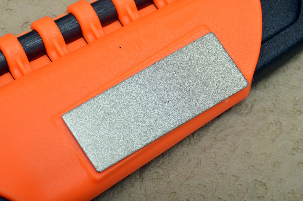 Nella convinzione, sorretta dalla pratica, che ciò che non taglia non potrà mai essere un coltello decente, qui la lama è molto affilata. Ma se con l’uso il filo si dovesse ottundere, nel fodero è inserita una placchetta diamantata per il ripristino. Dato il particolare tipo di arrotatura, è difficile sbagliare la riaffilatura. E’ sufficiente appoggiare il bisello in modo che sia completamente adagiato sulla lastra diamantata e l’angolo è esattamente determinato. L’importante è intervenire subito, non appena si avverte una minima perdita del filo, anche se la lama taglia ancora.
