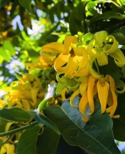 L’ylang -ylang, è un arbusto originario del Sud Est asiatico, delle Filippine, dell’Indonesia, del Borneo che cresce comunemente anche nelle isole della Polinesia e in quelle dell’Oceano Indiano come quelle del Madagascar. Le sue foglie lucide verde scuro hanno margini ondulati, mentre i fiori dalle corolle a grappolo di colore giallo – oro- verde, numerosi e profumatissimi, presentano dai 3 ai 5 petali allungati e bizzarramente arricciati.