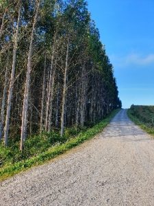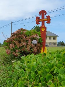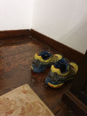 piantagioni di girasole, e all’orizzonte il nulla, fummo superati da un’automobile della Guardia Civil che al passaggio scatenò un enorme polverone sulla strada in terra battuta. Si fermarono subito dopo e scesero dal mezzo, salutando con un “hola, todo bien?”. Risposi al saluto. Capirono subito che eravamo italiani e ci chiesero da dove fossimo partiti. Risposi loro che viaggiavamo dalla Francia, e che avevamo già percorso oltre 380 km, e che da quando eravamo nelle Mesetas non avevamo incontrato nessun pellegrino. Pareva che il caldo micidiale li avesse fatti dissolvere nell’aria bollente. Per questo il poliziotto si era fermato: era sorpreso dalla nostra presenza, e dal fatto che nonostante la temperatura elevata (40°), avessimo ancora le borracce, piene di acqua. Guardò le mie scarpe ed esclamò: “Madre mia, italiano, tienes el motor !”. Scoppiammo a ridere insieme, e io gli dissi che si, le scarpe erano di qualità elevata, ma che soprattutto erano.. made in Italy!