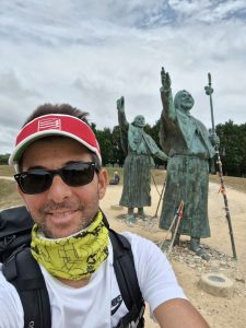 specifico, della statua di una madonna di colore che avevo di fronte, spiegandomi che rappresentava la Madonna Nera di Guadalupe, e che le sue origini, contrariamente a quanto si crede, sono spagnole, precisamente della regione dell’ Estremadura, e non messicane come in genere si crede. Quello che mi ha emozionato più dell’arrivo, in sé, e’ stata la vista dei cartelli stradali che comparivano di fronte, man mano ci si avvicinava alla città. E quando dopo una curva ho visto la tabella, con su scritto “Santiago km 47”, l’emozione fu davvero grande. Mancava poco, davvero, poco. Prima di scendere verso Santiago, mi sono fermato sul belvedere, dove si trovano due statue gigantesche raffiguranti dei pellegrini che scrutano l’orizzonte osservando la città dall’alto. Lì ho dedicato un pensiero ai miei cari, girando anche un filmato, dove racconto l’esperienza vissuta, e quelle emozioni che mi hanno accompagnato lungo tutto il cammino, e che avrei voluto non finissero mai.