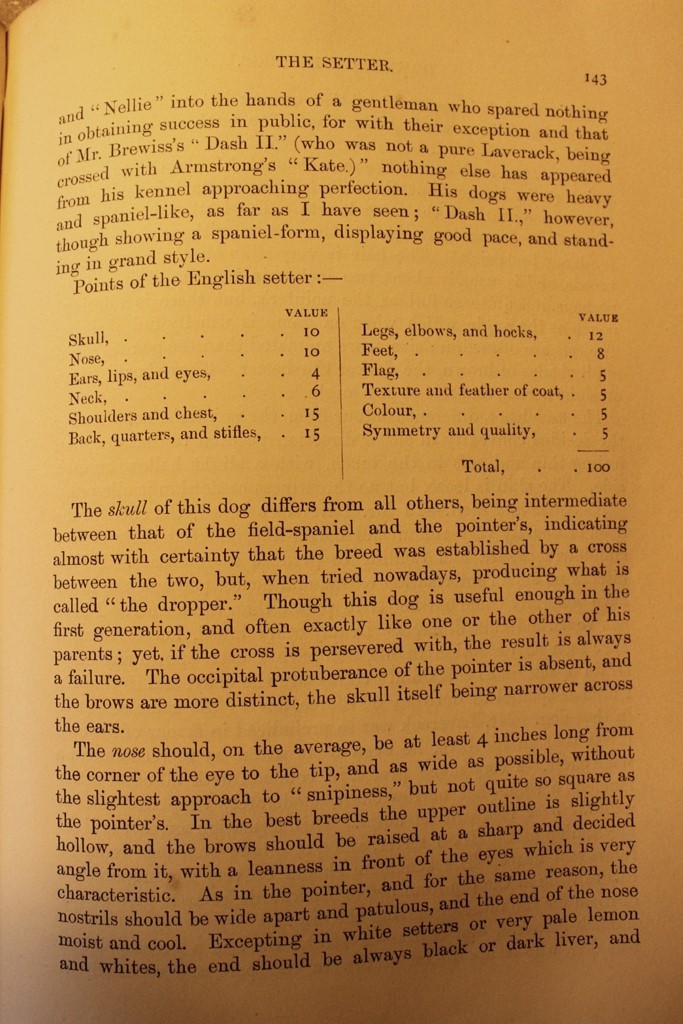 The skull of this dog differs from all others, being intermediate between that of the field-spaniel and the pointer’s, indicating almost with certainty that the breed was established by a cross between the two, but, when tried nowadays, producing what is called ” the dropper.” Though this dog is useful enough in the first generation, and often exactly like one or the other of his parents ; yet, if the cross is persevered with, the result is always a failure. The occipital protuberance of the pointer is absent, and the brows are more distinct, the skull itself being narrower across the ears. The nose should, on the average, be at least 4 inches long from the corner of the eye to the tip, and as wide as possible, without the slightest approach to ” snipiness,” but not quite so square as the pointer’s. In the best breeds the upper outline is slightly hollow, and the brows should be raised at a sharp and decided angle from it with a leanness in front of the eyes which is very characteristic. As in the pointer, and for the same reason, the nostrils should be wide apart and patulous, and the end of the nose moist and cool. Excepting in white setters or very pale lemon and whites, the end should be always black or dark liver, and even in them it is preferred of that colour ; but a pink nose may be pardoned in a whole white dog. The teeth should be quite level.