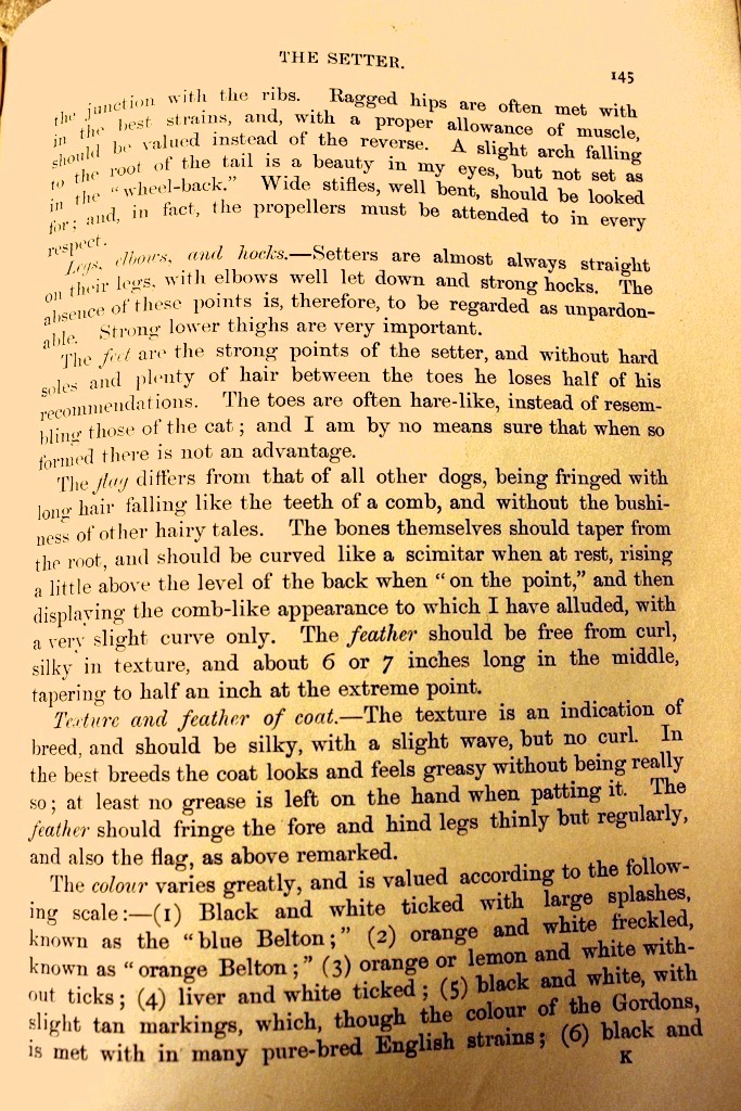 The flag differs from that of all other dogs, being fringed with long hair falling like the teeth of a comb, and without the bushiness of other hairy tales. The bones themselves should taper from the root, and should be curved like a scimitar when at rest, rising a little above the level of the back when “on. the point,” and then displaying the comb-like appearance to which I have alluded, with a very slight curve only. The feather should be free from curl, silky in texture, and about 6 or 7 inches long in the middle, tapering to half an inch at the extreme point.