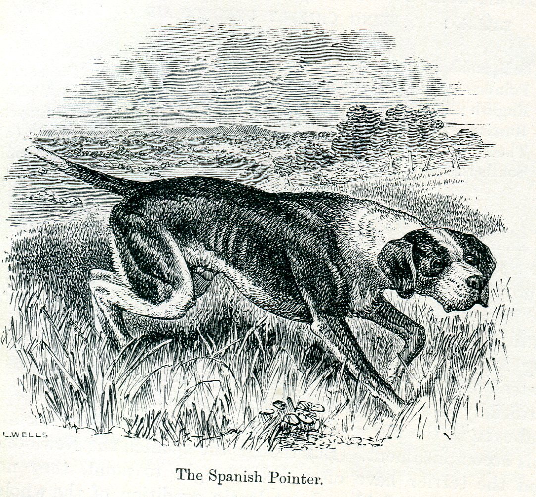 di Delabere Blaine, redatta nel 1850, dice la sua: “ Il pointer è principalmente limitato al tipo inglese, spagnolo e russo, nonché ad una varietà minore conosciuto da alcuni come pointer francese…Il pointer spagnolo, pesante e lento, ha i suoi meriti dimostrati in incroci con setter e foxhound, dove ha unito la potenza olfattiva con grande forza fisica, e questo lo rende meritevole dei nostri riguardi….L’origine diretta del pointer inglese è avvolta in molta oscurità. Molti scrittori offrono i loro suggerimenti, ma nessuno offre prove, il fatto certo è che il pointer, con ogni probabilità, presenta un’origine molto mescolata rientrando nel suo retaggio sangue hound e sangue spaniel che ne hanno preso parte in tempi diversi.” Uno dei pointers più famosi della storia antica della razza è difatti Dash, di proprietà del colonnello Thornton, straordinario velocista dal cuore d’acciaio e superbo fermatore a distanze iperboliche. Se si fosse ai tempi d’oggi lo si direbbe un “crack” fra i trialer. Era frutto diretto dell’accoppiamento fra un foxhound ed una pointer spagnola bianca e marrone e fu uno dei cani più spettacolari “..che abbiano mai attraversato un campo o mai percorso un moor…” come lo stesso Blaine descrive nella sua “bibbia” cinotecnica. Non produsse, direi ovviamente, figli degni di nota, ma aprì una strada fondamentale e documentata, che è poi il punto cruciale dell’intera vicenda delle origini del pointer: l’incrocio ripetuto e la successiva riselezione tra i pointer inglesi di prima selezione, i bracchi portoghesi e spagnoli puri ed il leggendario foxhound, il più grande atleta